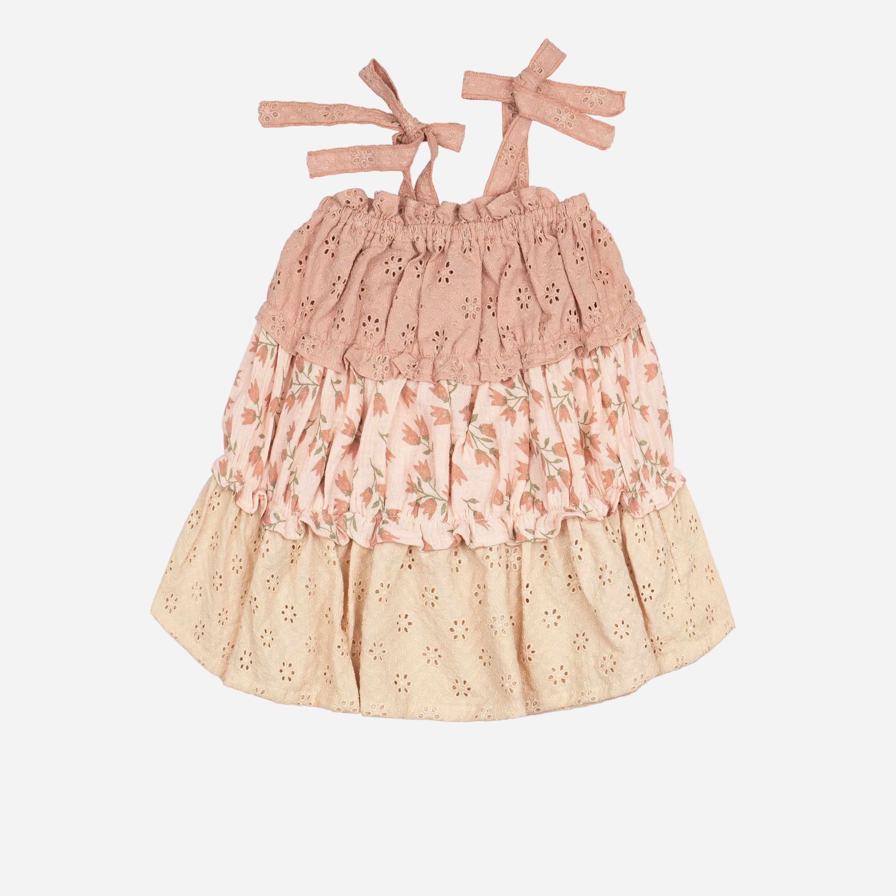 This special edition showcases beloved hand-drawn floral prints from past collections, thoughtfully paired with tiers of delicate broderie anglaise for a romantic, vintage-inspired feel. Adjustable tie straps make it easy to find the perfect fit, while the gentle A-line shape flows beautifully with every step.