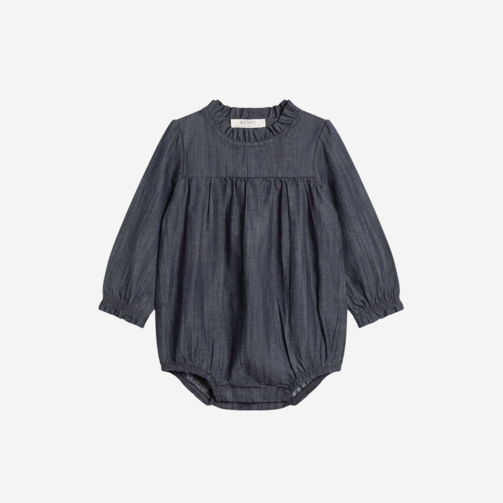 Soft, airy, and full of charming detail, this chambray romper brings ease and sweetness to every moment. The ruffled neckline adds a playful touch while elastic cuffs and leg openings keep baby comfy through wiggles, crawls, and cozy days at home.