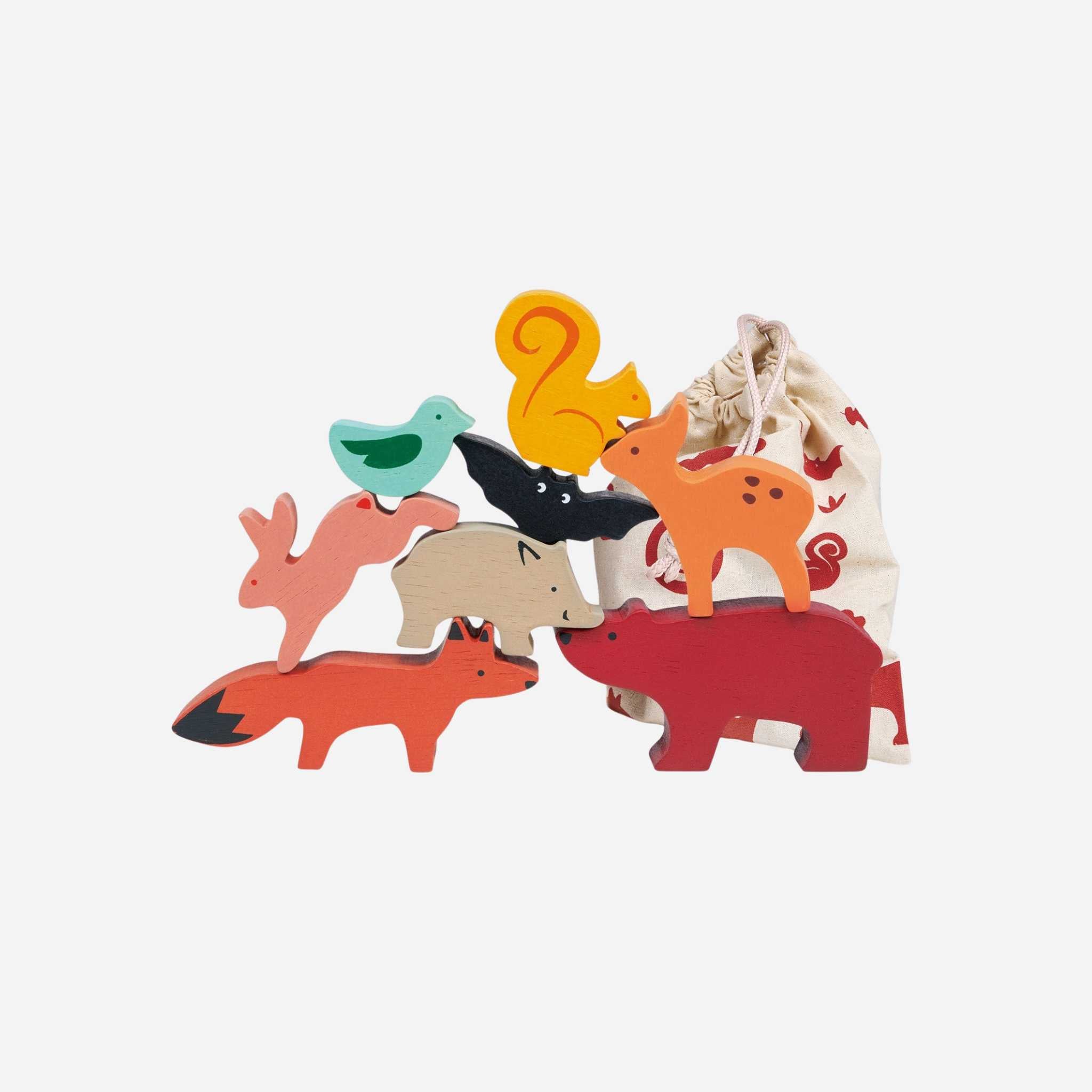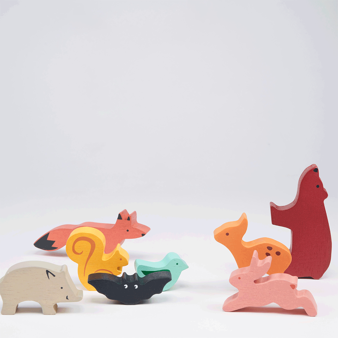 The set includes a delightful cast of forest friends—a running rabbit, wild boar, squirrel, fox, bear, deer, bat, and bird—packed neatly in an illustrated drawstring bag for easy storage and play on the go.