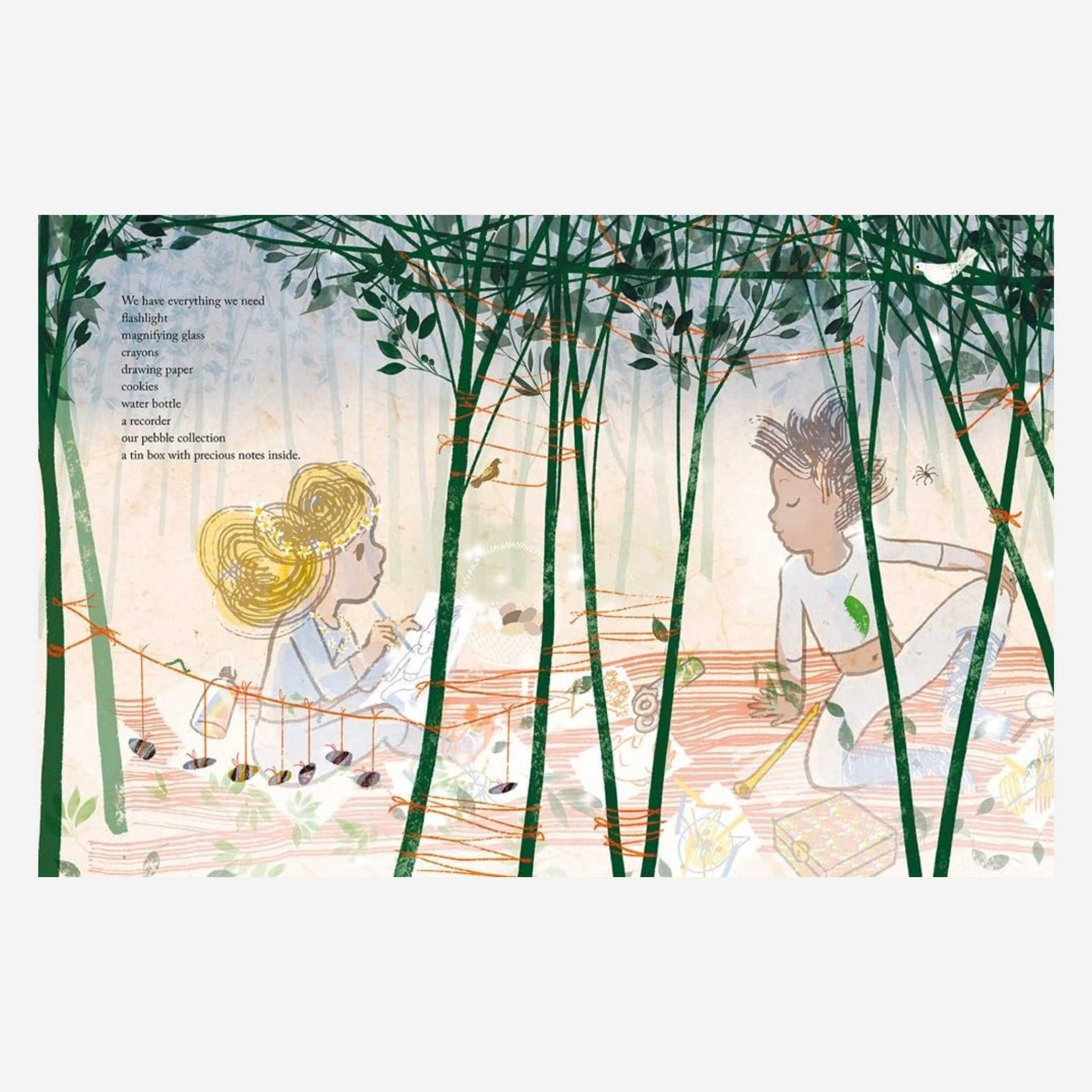 With poetic, lyrical text and breathtaking illustrations by acclaimed Italian Children’s Laureate Alessandro Sanna, this story follows two siblings who create a hidden world all their own. Their hideaway—made of branches and singing leaves—holds endless possibility. In its small space, they travel across savannas, sip afternoon tea, sleep beneath the stars, and stretch their imaginations as far as they can dream… until the outside world gently calls them back.