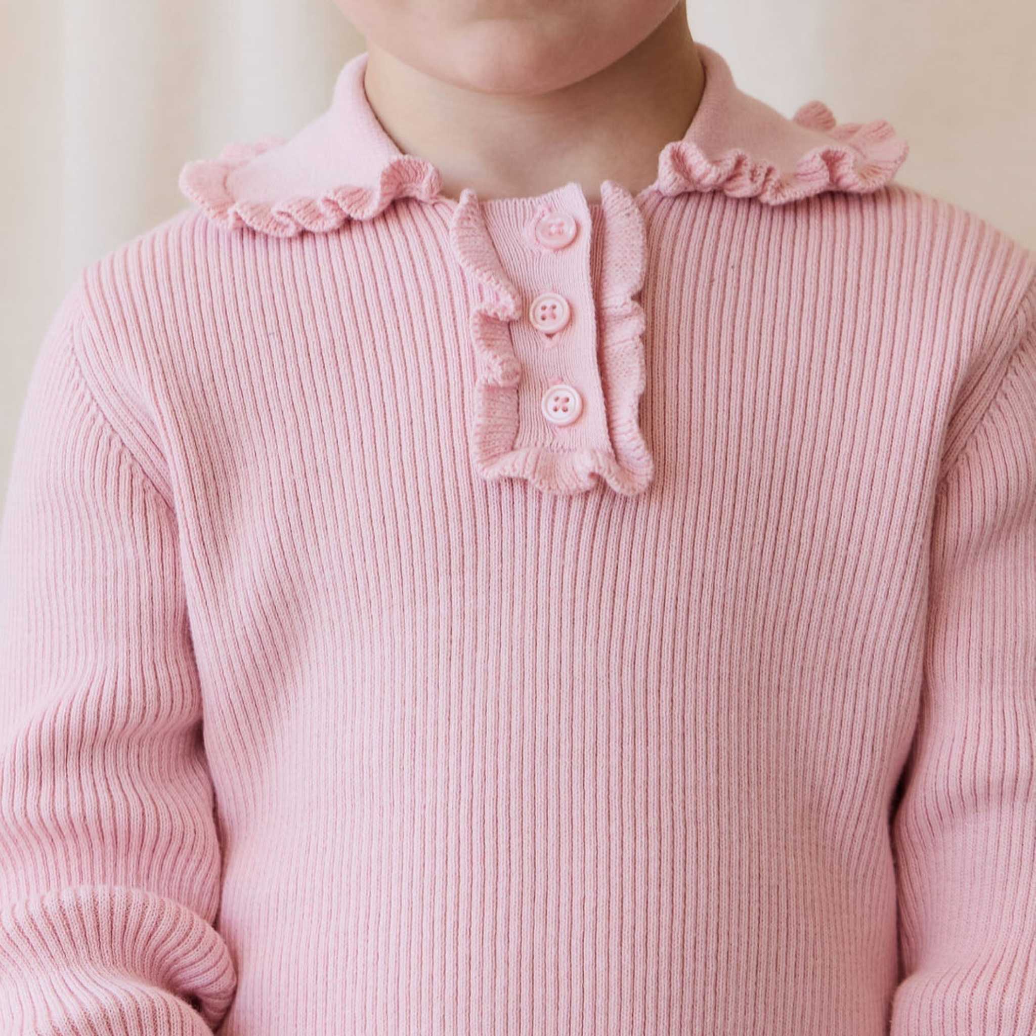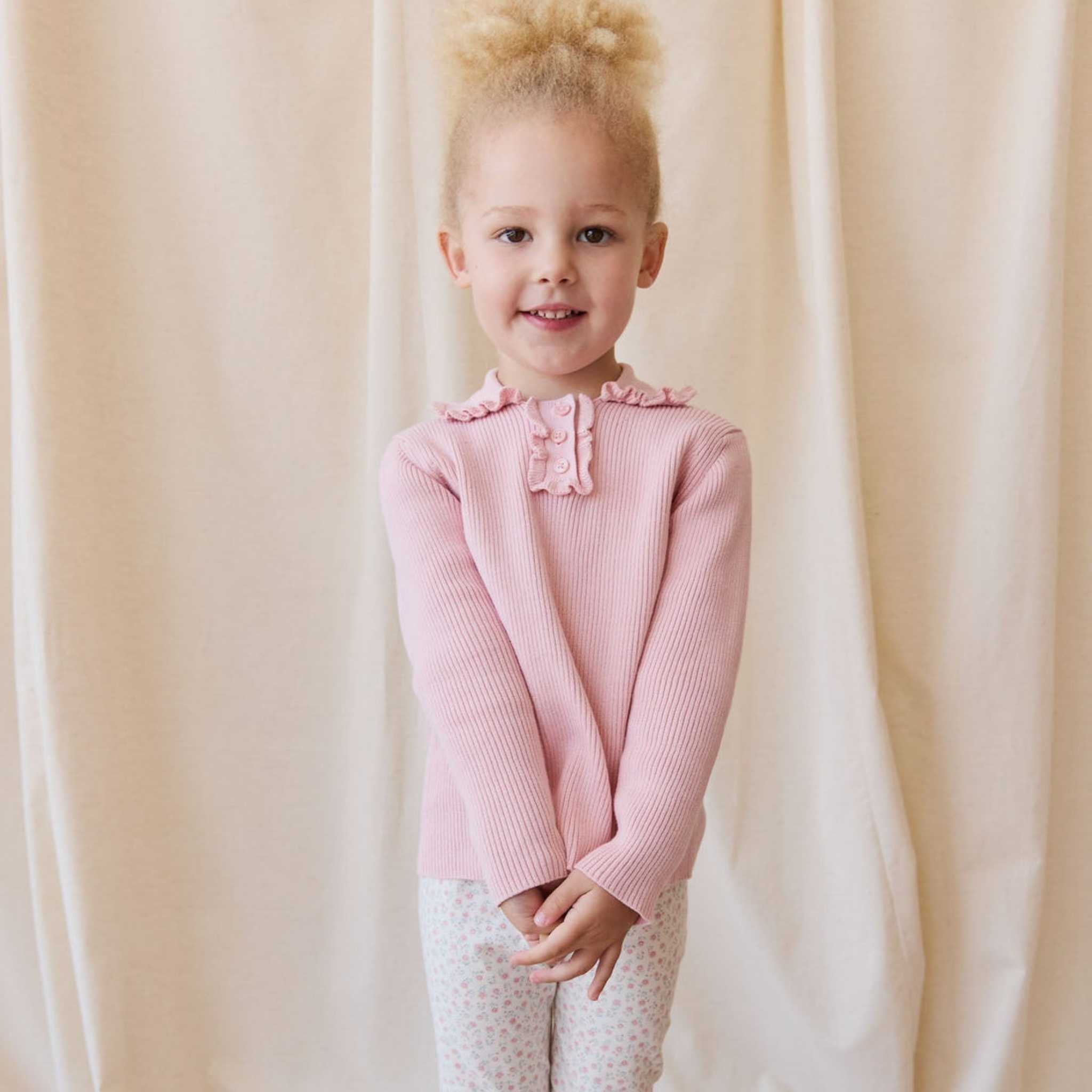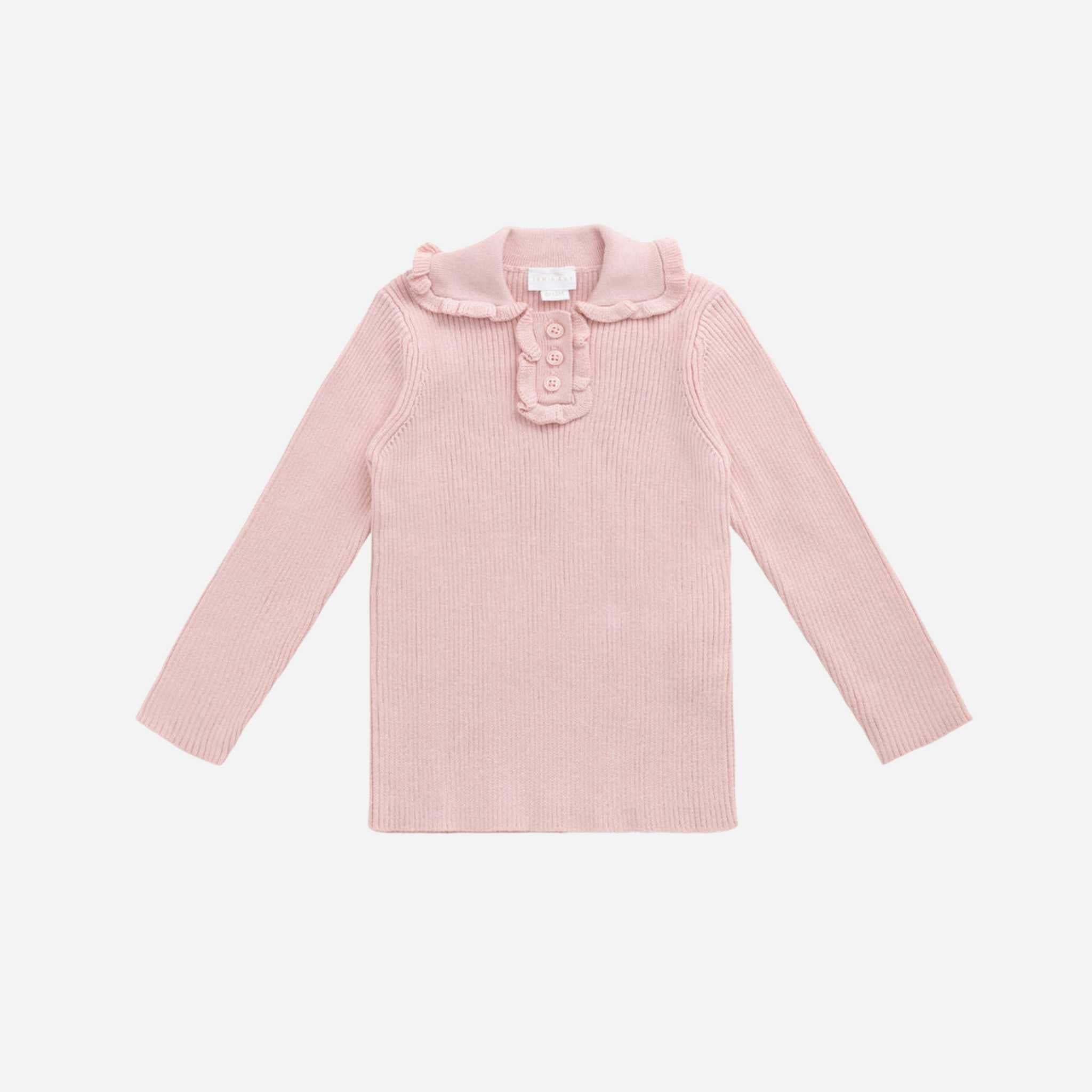 Sweetly refined and effortlessly wearable, the Cleo Top in Trinket is a beautifully knitted essential with timeless appeal. Designed in a soft blush hue, it features a delicate ribbed texture and ruffled collar for a touch of everyday elegance. Perfect for layering under overalls or pairing with skirts and bloomers, it brings comfort and charm to every outfit.