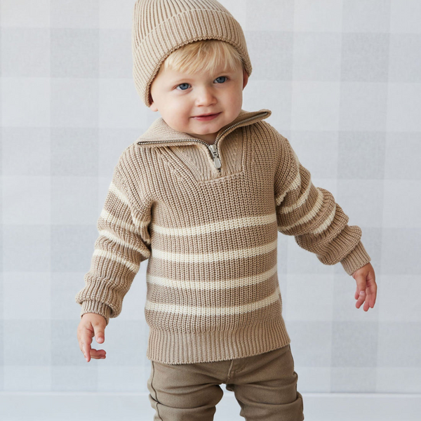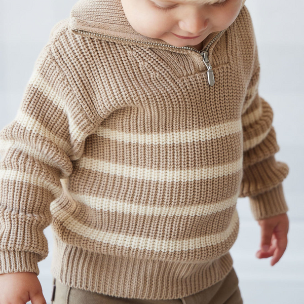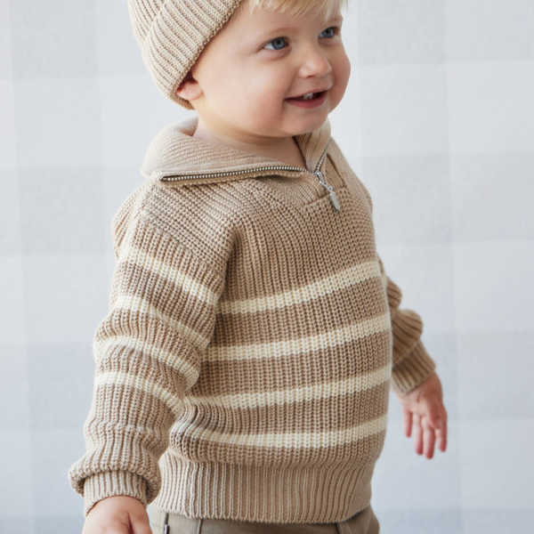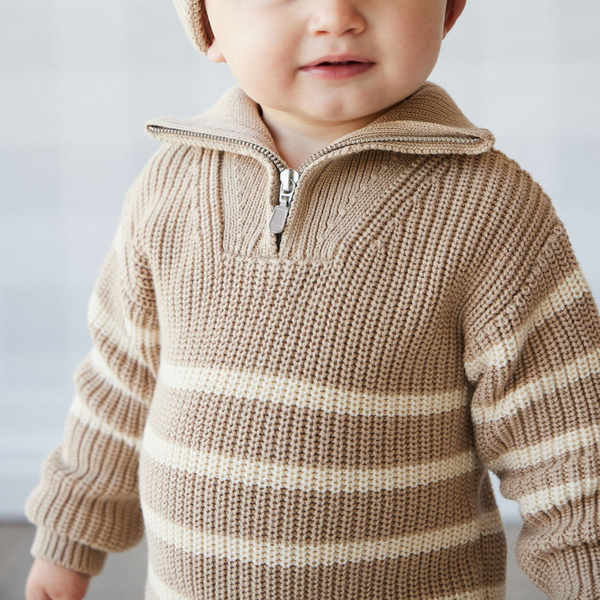 Add To BabylistKeep your little one snug and stylish with the Jack Zip Jumper in Lenny Stripe Fawn by Jamie Kay. Made from 100% premium cotton, this cozy jumper is designed to provide warmth while ensuring your child stays comfortable and free to play.