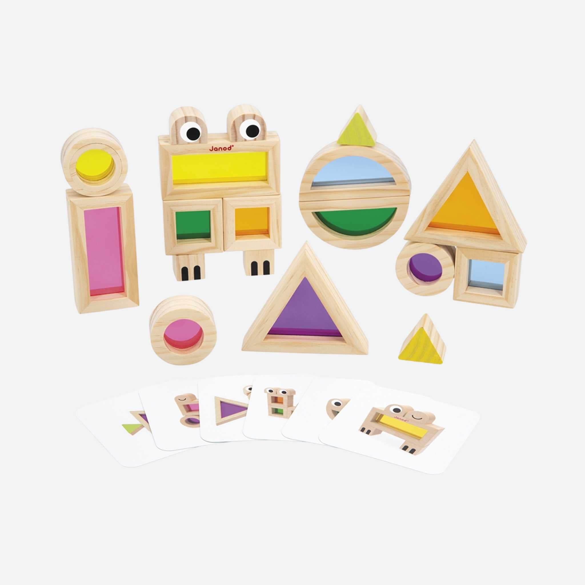 Playful design: Includes 12 translucent geometric shapes in cheerful hues—orange, pink, yellow, purple, blue, and green—plus 6 wooden blocks printed with eyes, paws, and ears for character-building fun.