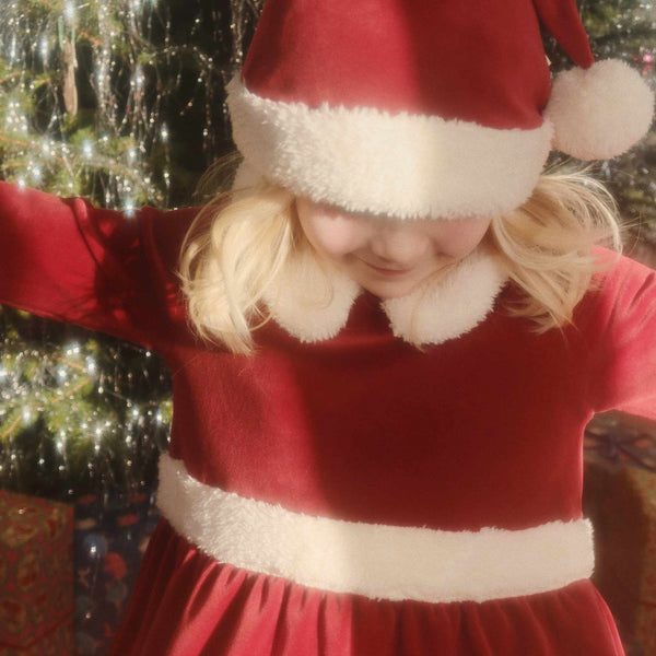 A timeless holiday classic, the Christmas Hat in Red Dahlia is made from plush red velvet with a soft white contrast trim for that festive, cozy look everyone loves. Whether for family photos, gift-giving, or simply celebrating the season together, this hat adds instant cheer and warmth to your little one’s winter days.