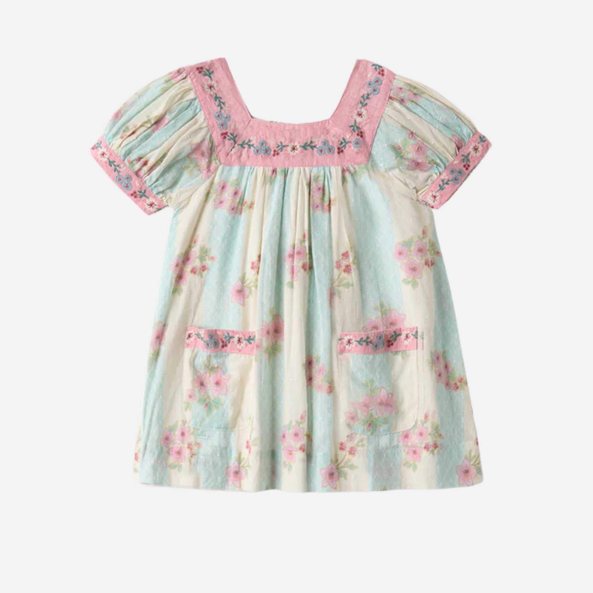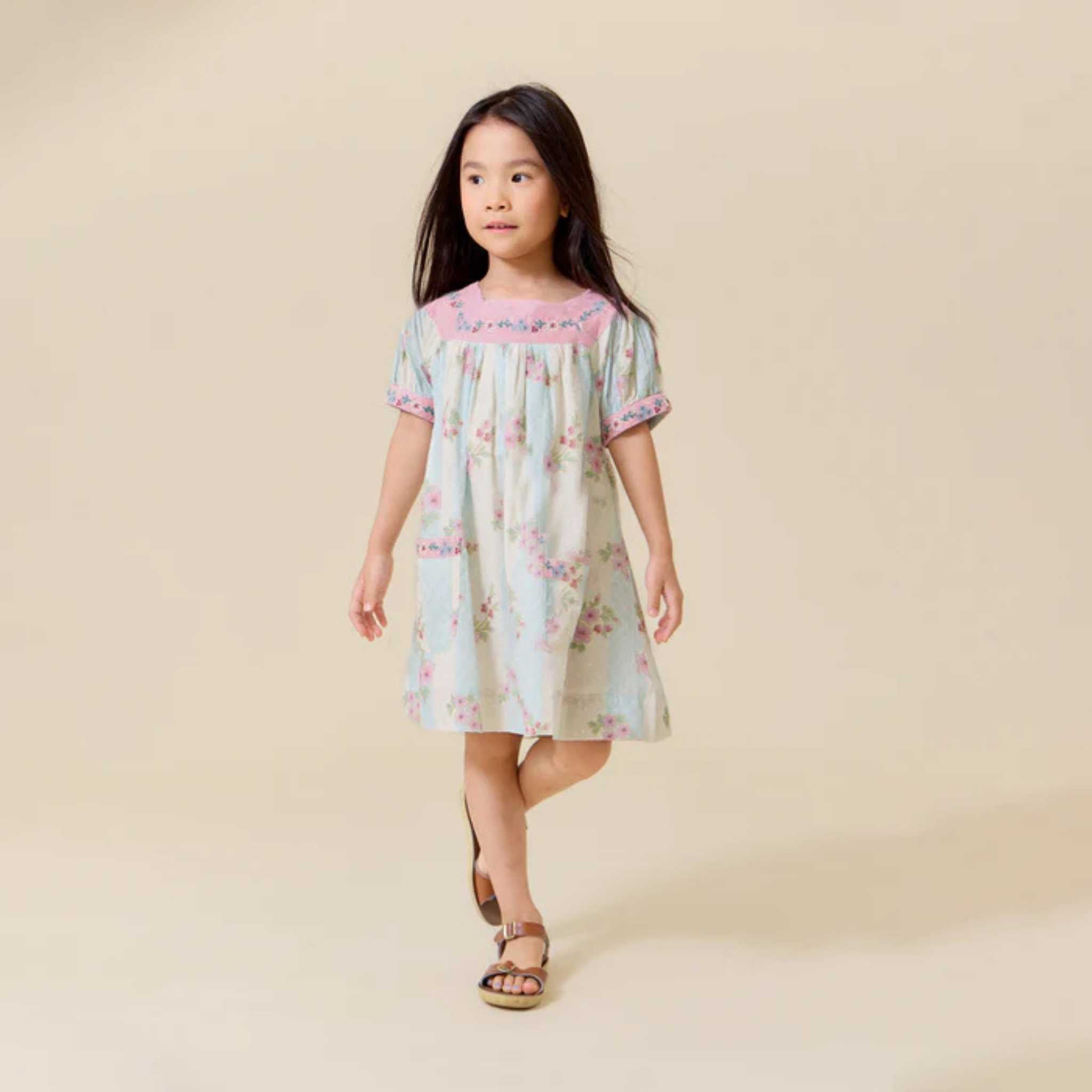Delicate embroidery along the neckline, sleeves, and pockets adds a thoughtful, handcrafted touch—elevating its simple shape while keeping it playful and practical. It’s the kind of dress that transitions seamlessly from everyday playdates to family outings and vacation moments.