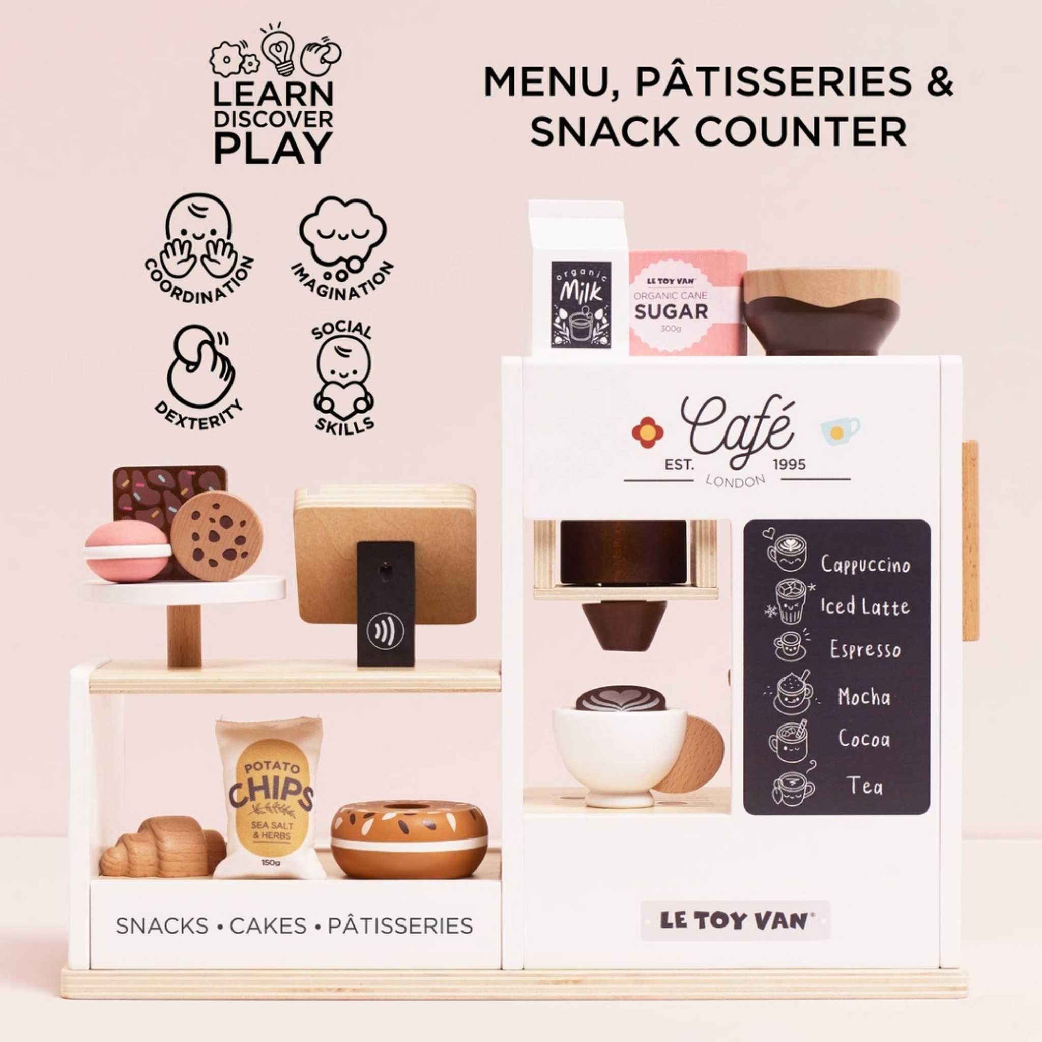 Interactive extras: Includes a food display area, cake stand, chalkboard till, and a stamp-style loyalty card for added play.