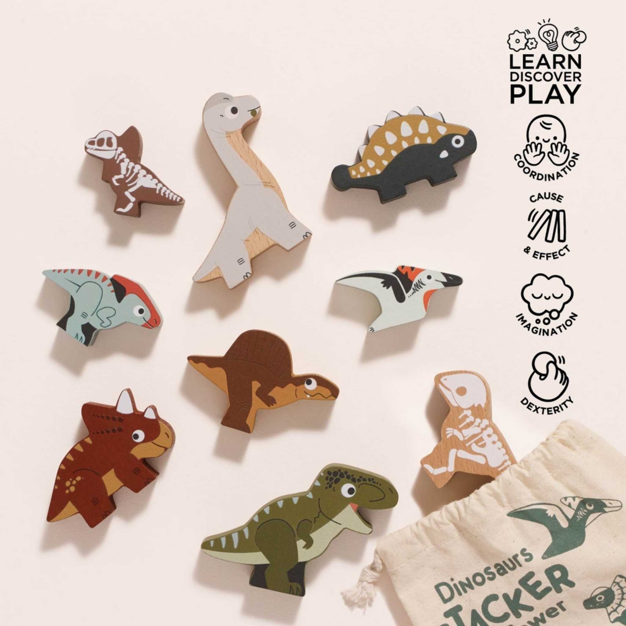 Interactive play: Includes 9 wooden dinosaur pieces that can be stacked, balanced, and toppled for hours of engaging fun.