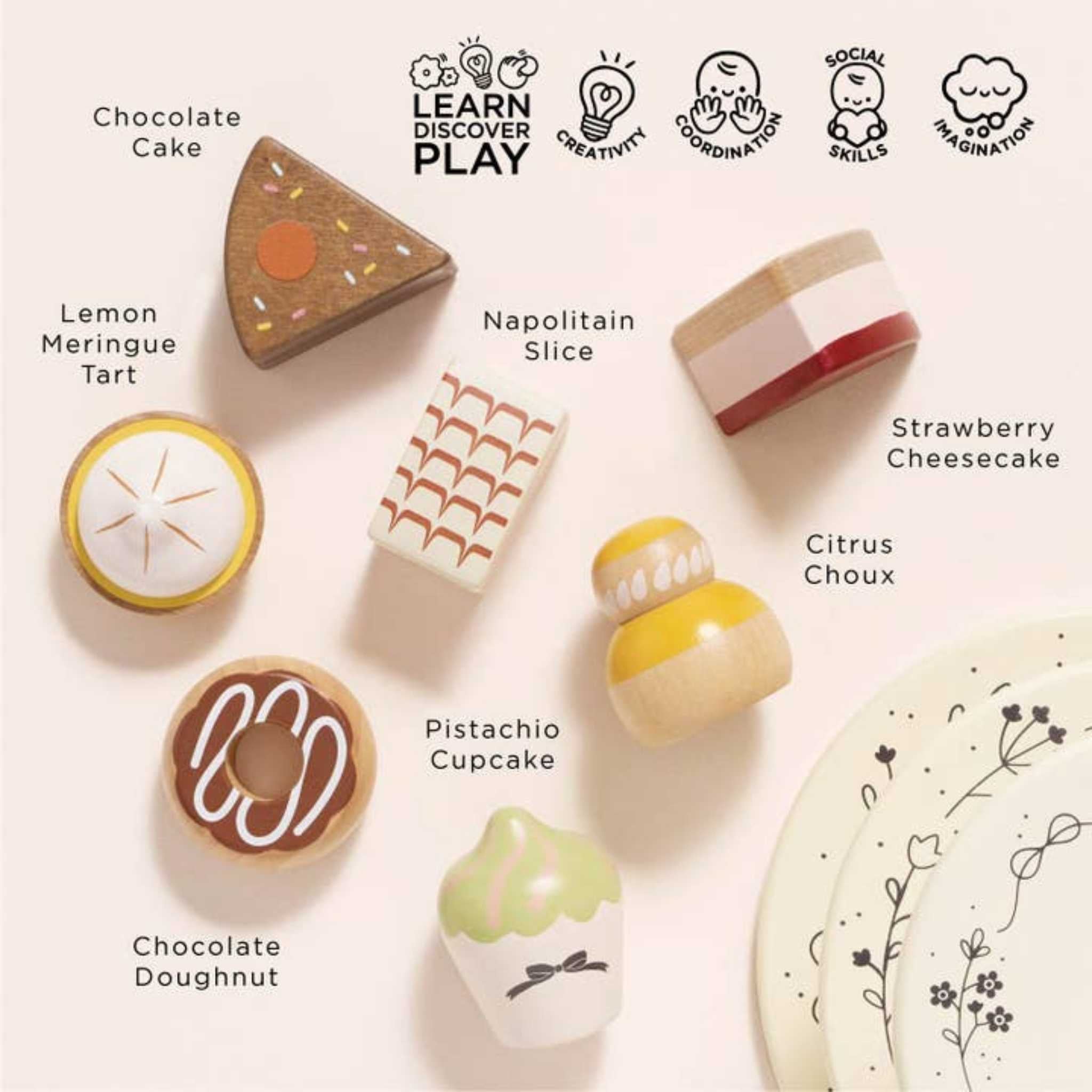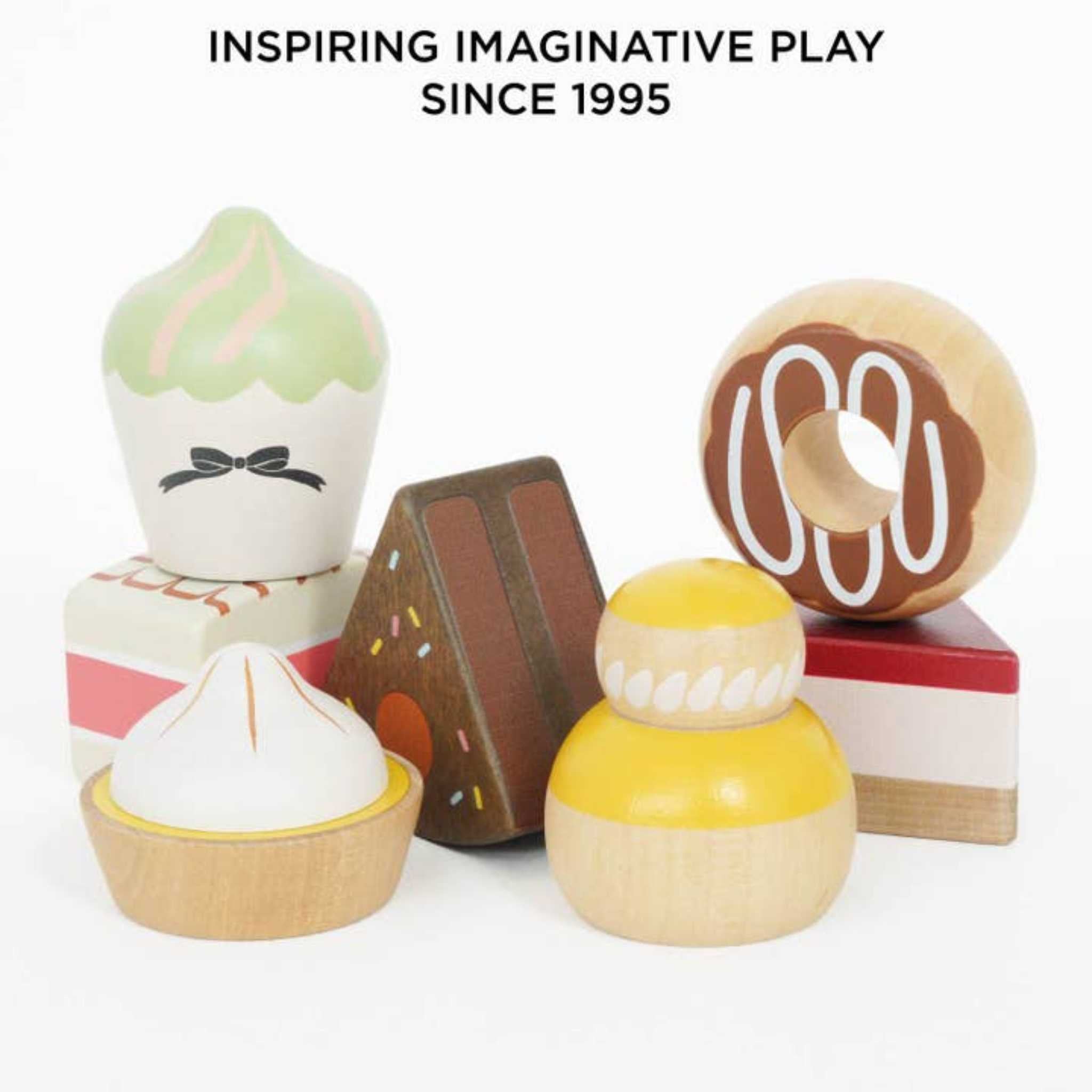 Celebrate every little occasion with this charming three-tier wooden cake stand and a selection of seven sweet treats. Perfect for imaginative tea parties, pretend baking, or simply a playful display of desserts.