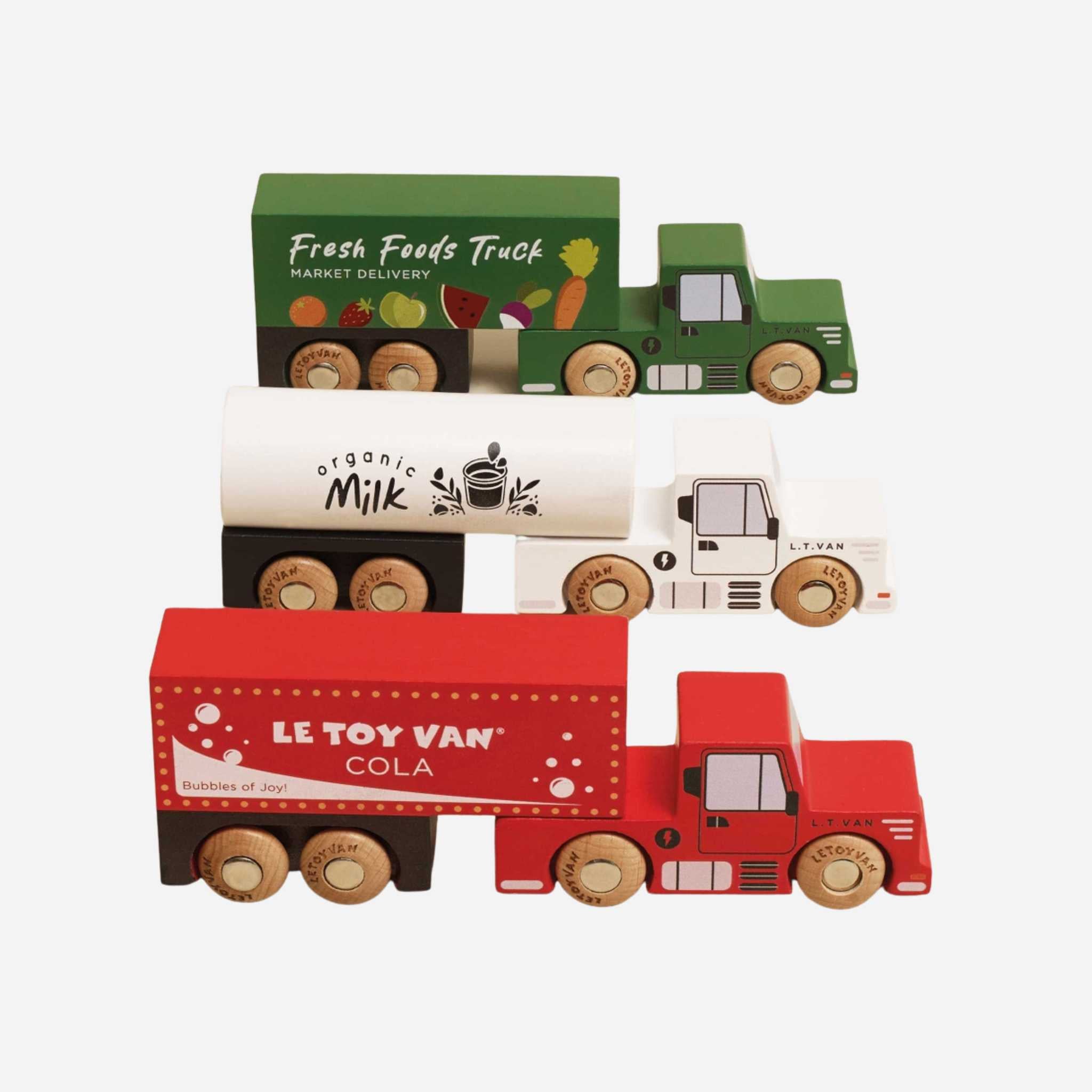 Complete set: Includes three themed trucks—Cola Drinks Truck, Fresh Food Truck, and Organic Milk Truck—each with a removable trailer for interactive play.