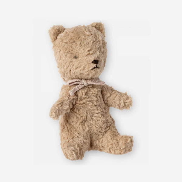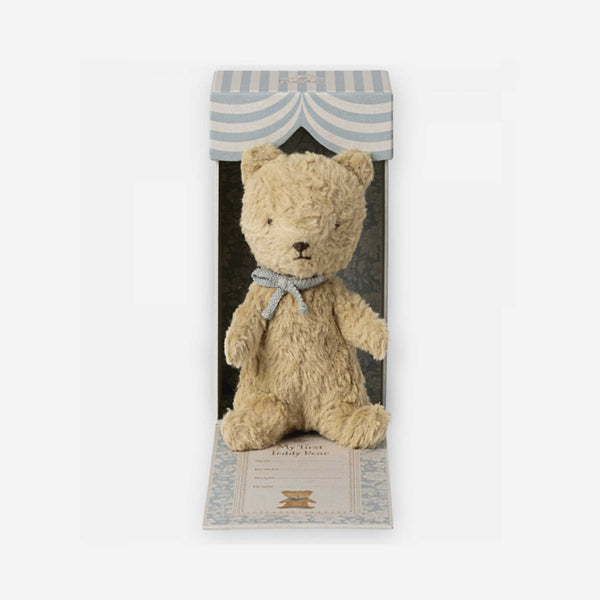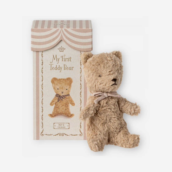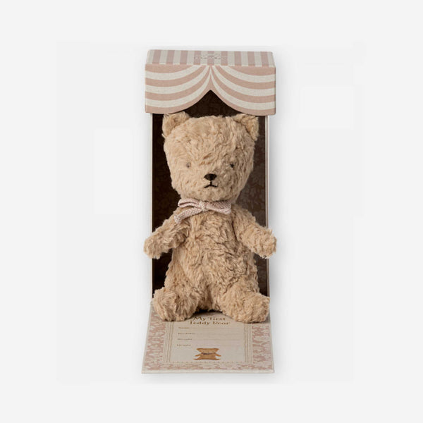 Add To BabylistCelebrate the arrival of your bundle of joy with Maileg's My First Teddy—a timeless treasure destined to become a cherished companion for years to come. Crafted with exquisite attention to detail and adorned in exclusive fabric, this teddy exudes a sweet, classic vintage charm that captures hearts and imaginations alike.