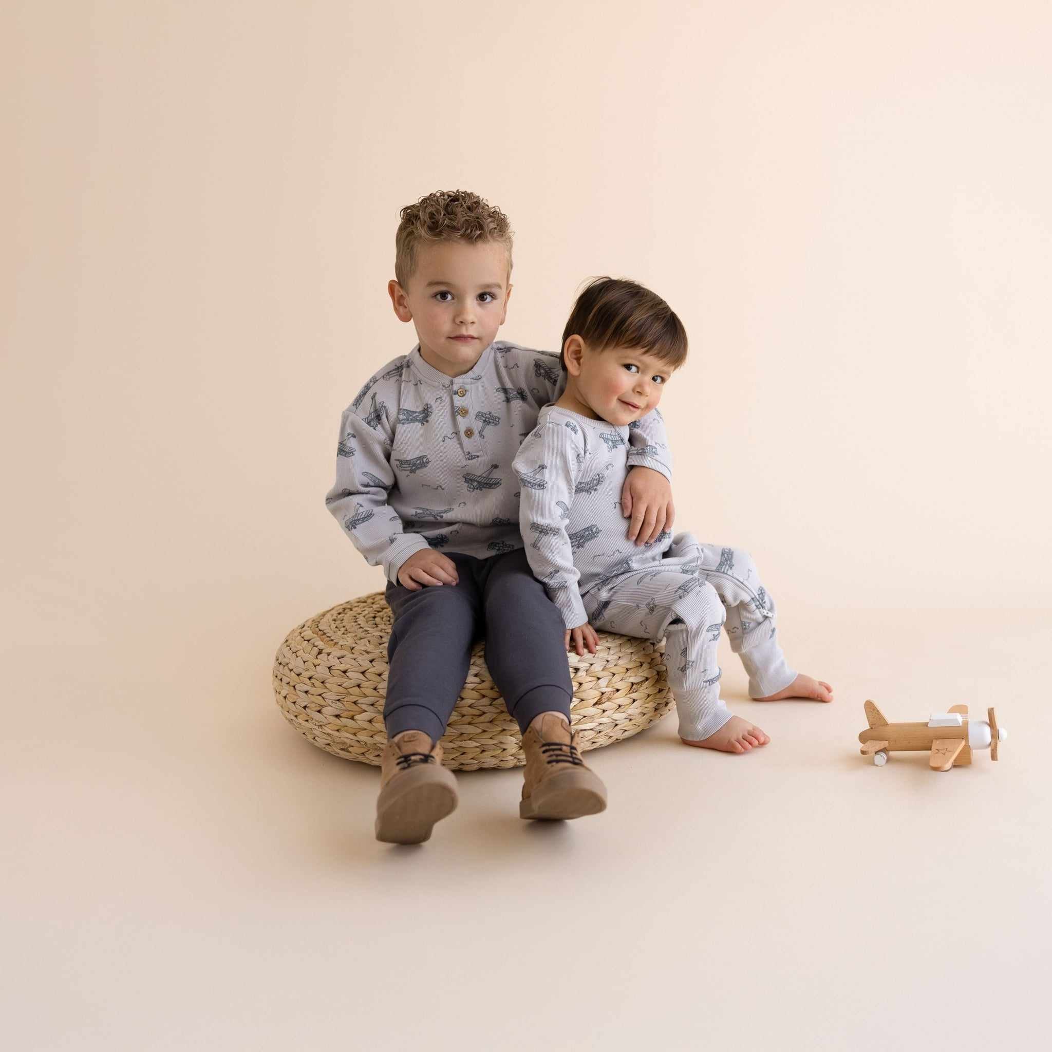 A soft essential for everyday play, the Organic Henley Tee in Airplanes brings timeless comfort with a touch of adventure. Crafted from ultra-soft organic cotton with a hint of stretch, this long-sleeve tee is designed to move with your little one. The classic Henley buttons add a polished finish—perfect for layering on cooler days or wearing solo for easy comfort.