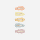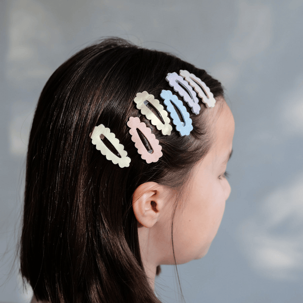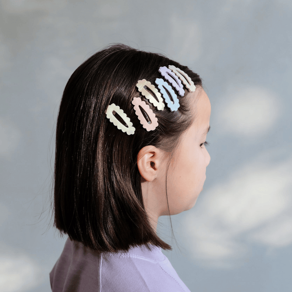 Add To BabylistSimple, sweet, and sparkling just right—these mini clips bring a subtle shimmer to everyday hairstyles. The soft scalloped edges add a delicate touch, while the mix of pastel glitter and metallic gold fabrics make each clip a tiny treasure.