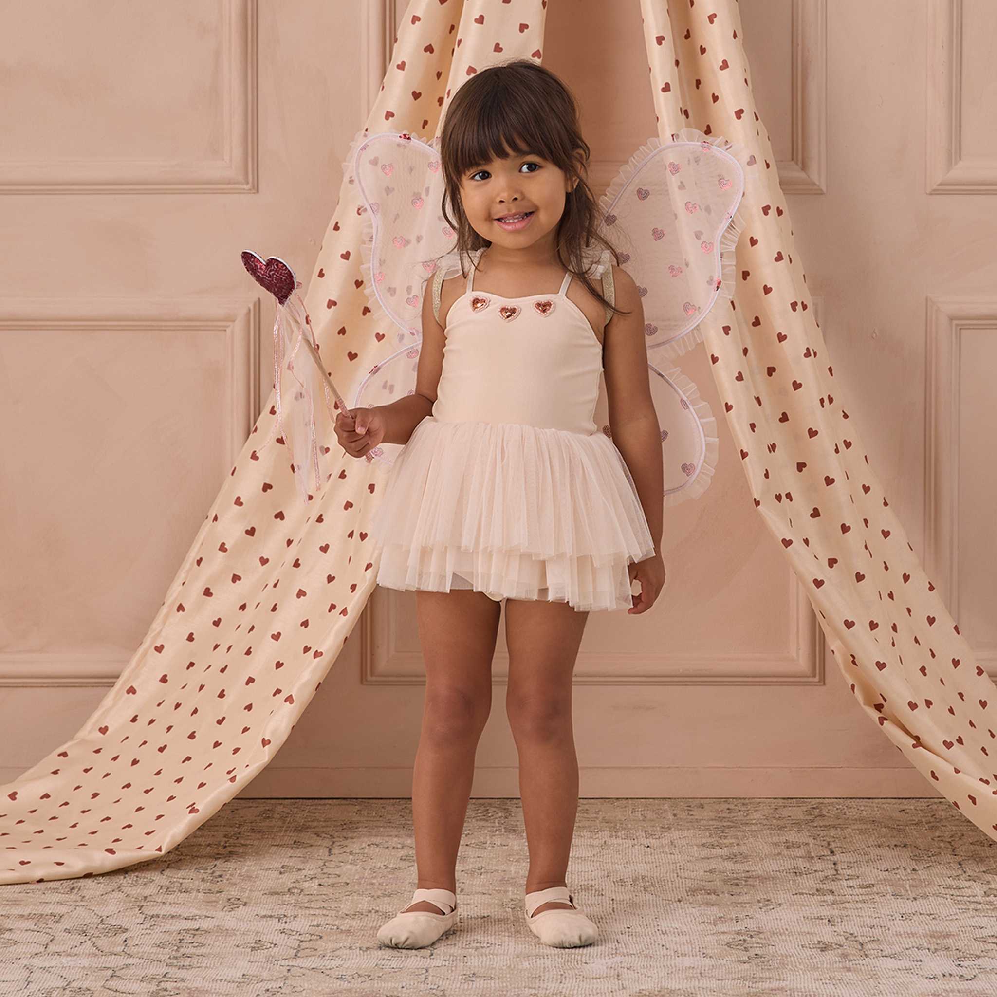 Sparkling heart details: Crafted from soft blush tulle adorned with red heart sequins for a touch of magic and romance