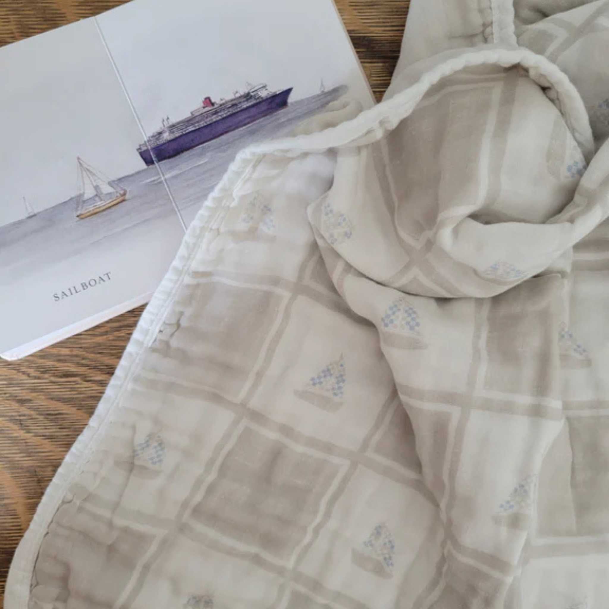 Timeless, heirloom-inspired, and beautifully crafted, the Quilted Sailboats 6 Layer Gauze Blanket by Ellie and Layne is a soft and spacious essential designed to grow with your little one. Created in collaboration with Melissa Johnson Design, this special piece features hand-painted sailboats set against a neutral patchwork pattern—bringing a gentle nautical charm to nurseries and cozy corners alike.