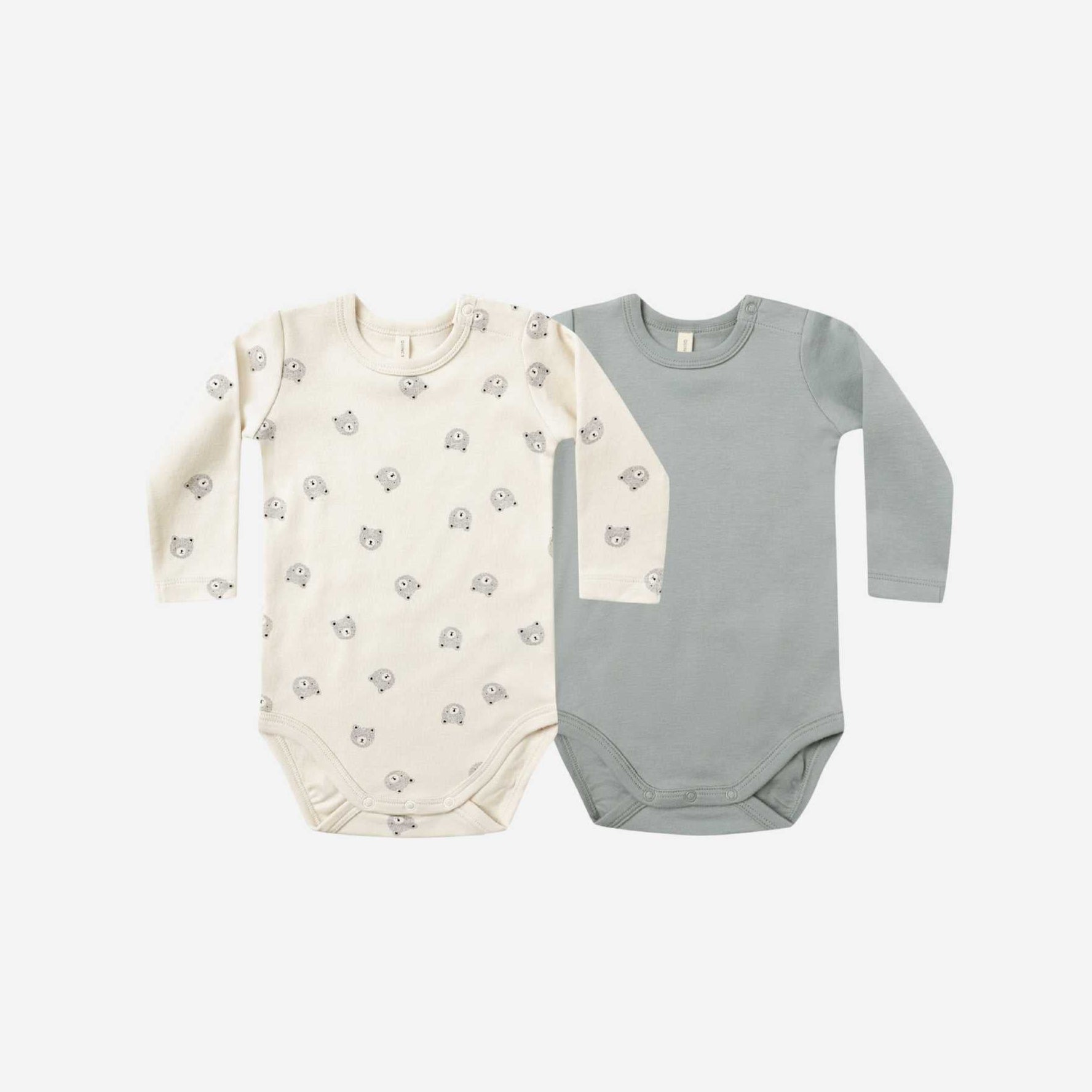 Charming coordination: One bodysuit features a sweet Bears print on ivory, while the other comes in a calming Steel Blue—perfect for mix-and-match versatility.