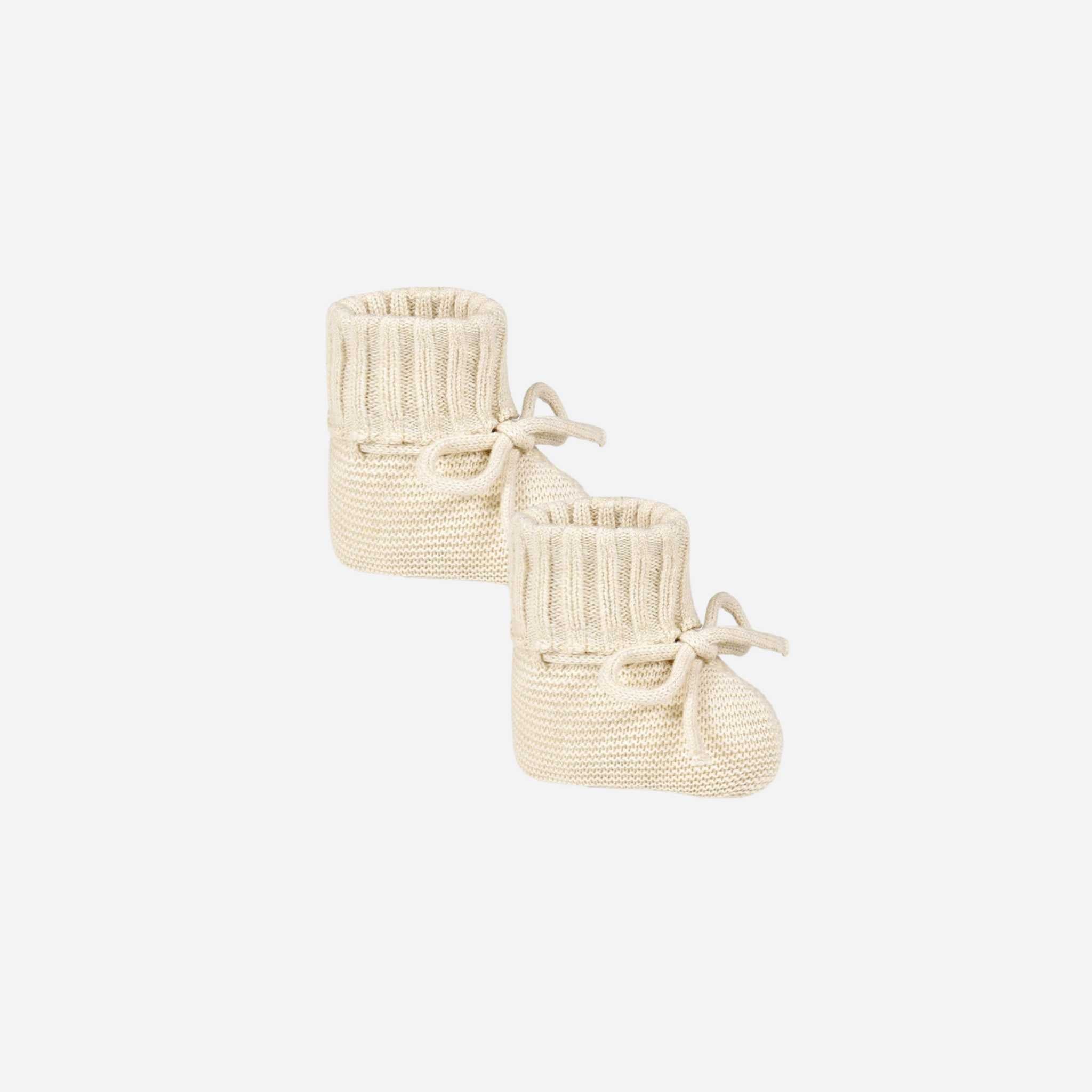 Keep little toes snug, cozy, and stylish with these soft knit booties in a timeless heathered natural hue. Made from 100% organic cotton, they feel gentle against delicate skin while offering a secure fit with a foldover cuff and sweet self-ties at the ankle.