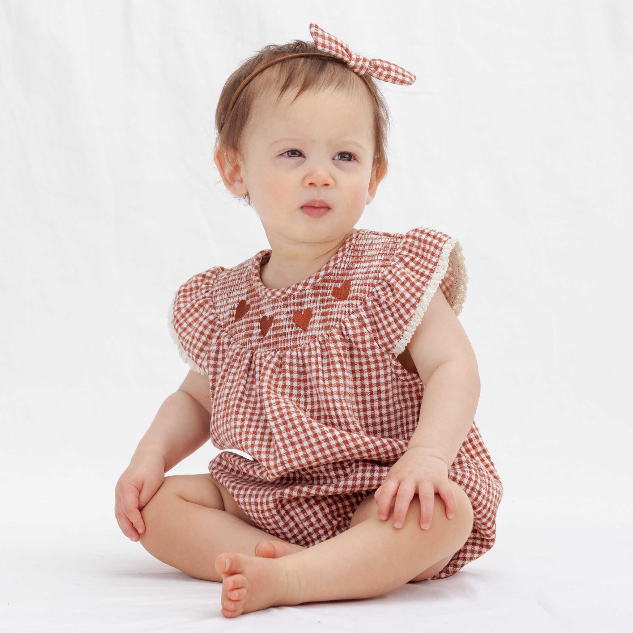 Sweet, timeless, and full of delicate details, the Lenore Romper by Quincy Mae is a charming Valentine’s Day style designed for baby’s comfort and easy wear. Crafted from soft organic cotton, this classic red gingham romper feels both special and effortlessly wearable.