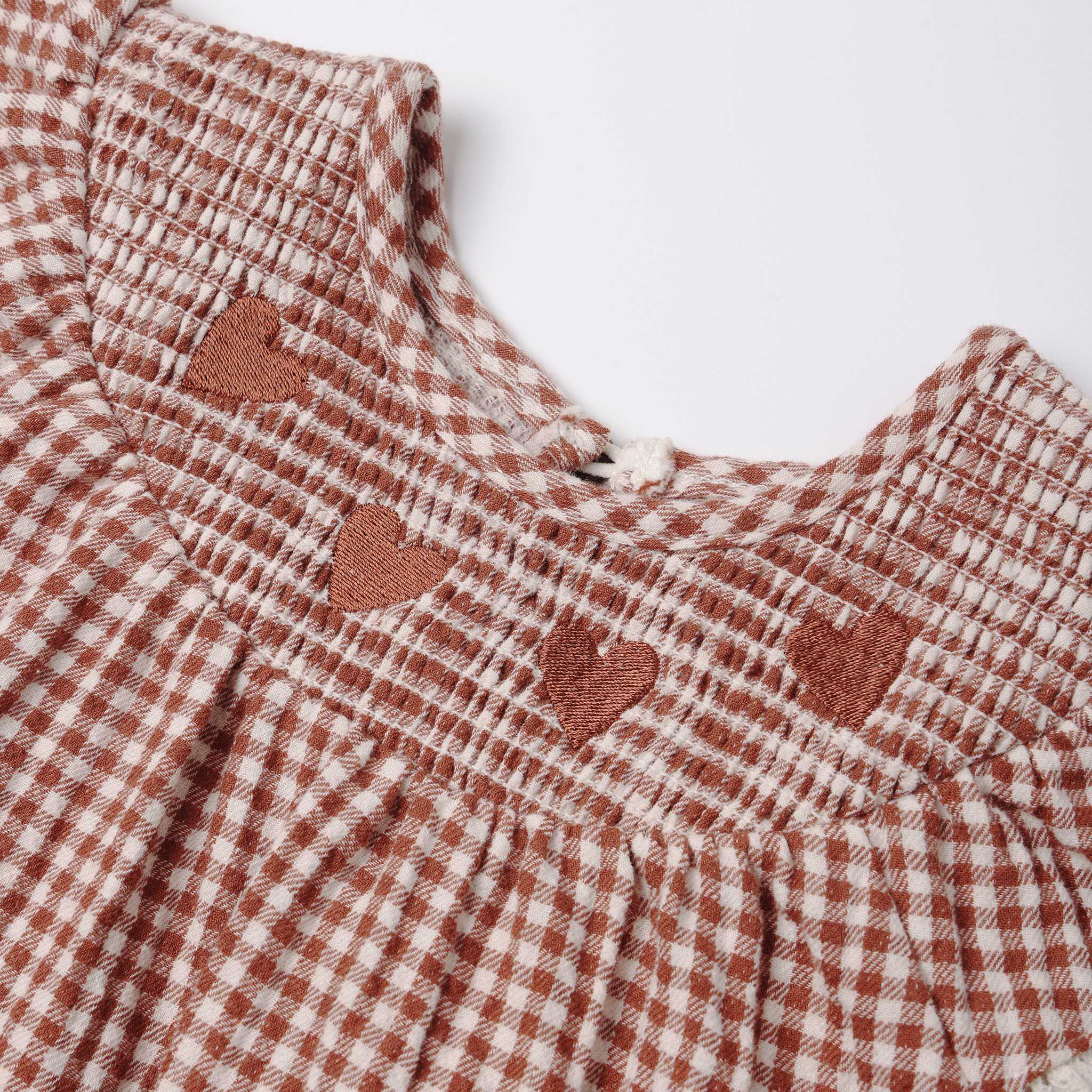 Smocked neckline: Delicate smocking with embroidered hearts adds charm and flexibility