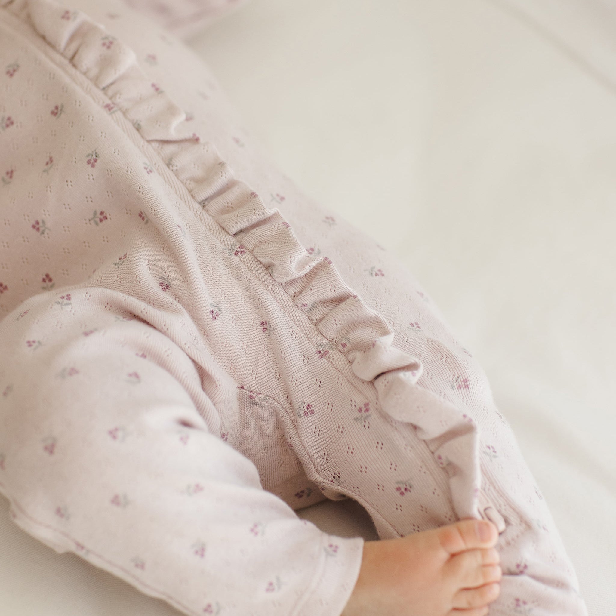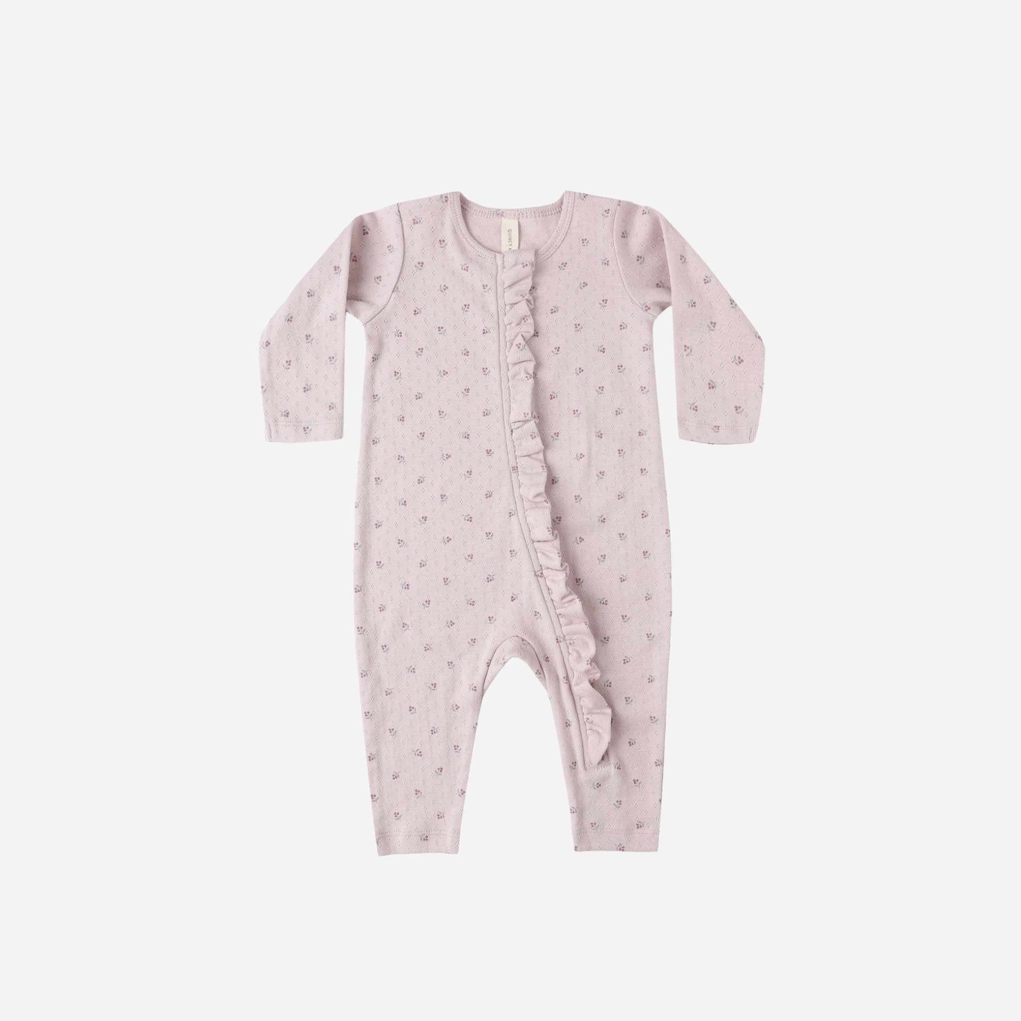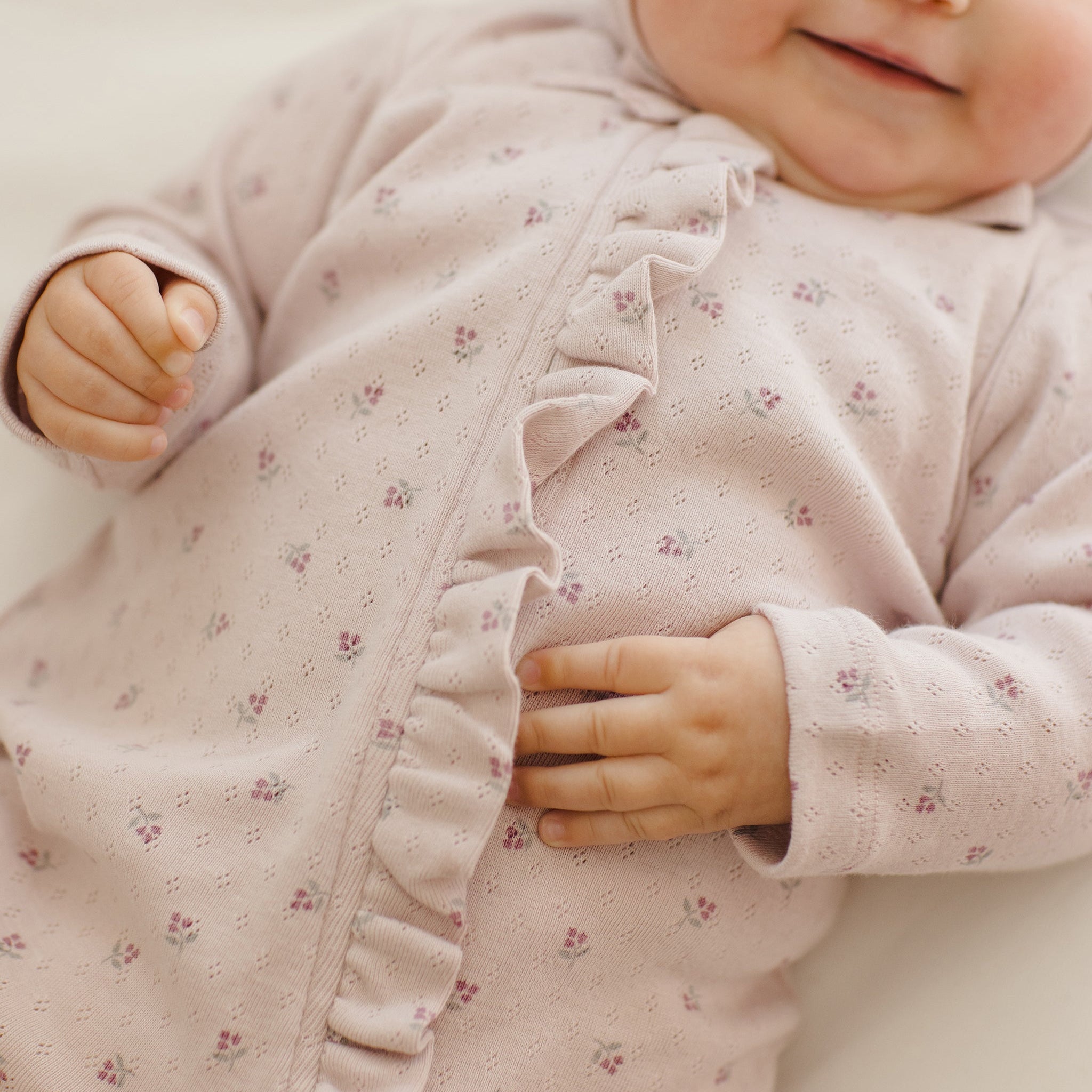 A sweet all-in-one for everyday comfort. The Ruffle Jumpsuit is crafted in soft organic pointelle cotton, making it gentle on delicate skin while adding a touch of texture. The ruffle detail tracing the zipper brings just the right amount of charm, while the pretty lilac ditsy print brightens up this cozy piece. Thoughtful design meets timeless style, making this jumpsuit an easy favorite for play, rest, and everything in between.
