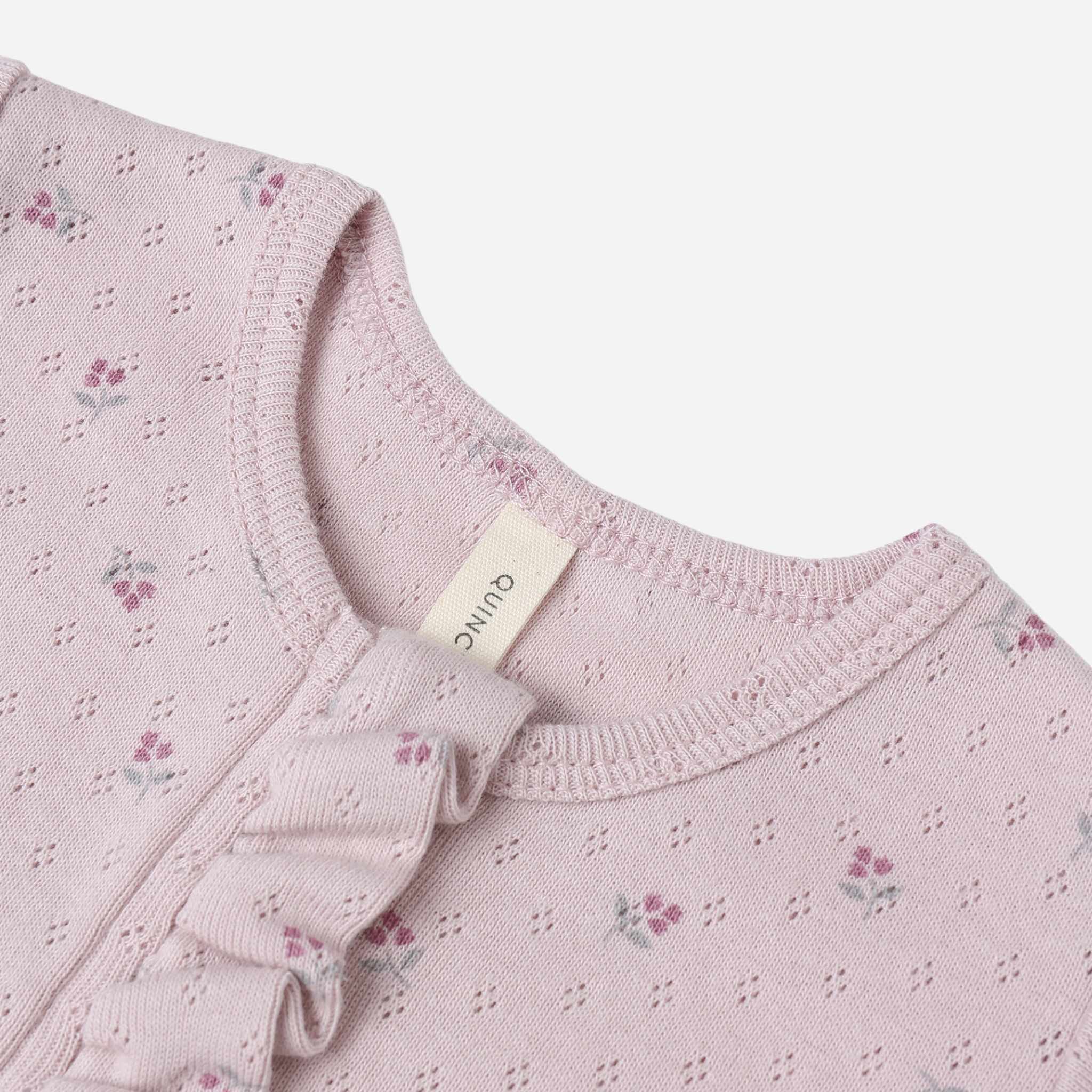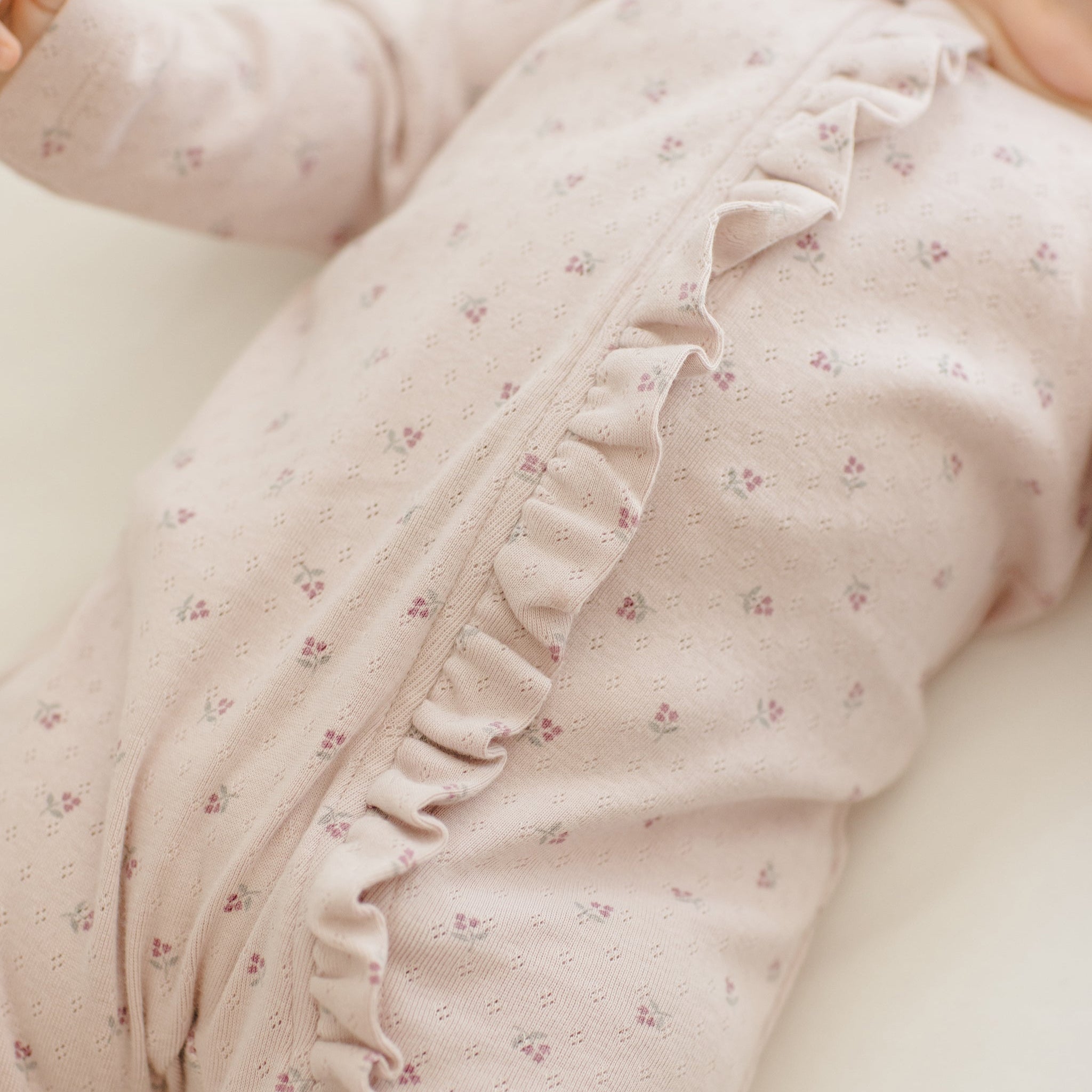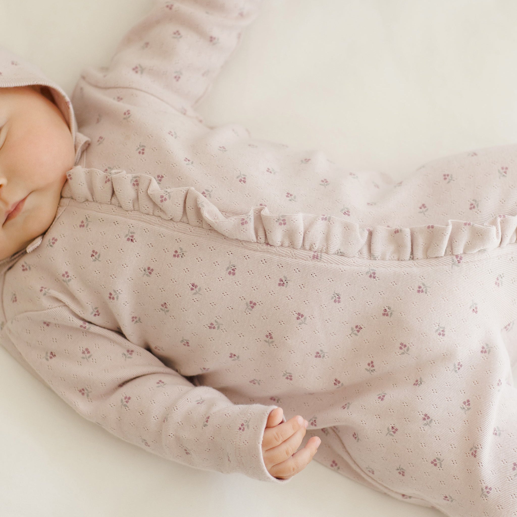 A sweet all-in-one for everyday comfort. The Ruffle Jumpsuit is crafted in soft organic pointelle cotton, making it gentle on delicate skin while adding a touch of texture. The ruffle detail tracing the zipper brings just the right amount of charm, while the pretty lilac ditsy print brightens up this cozy piece. Thoughtful design meets timeless style, making this jumpsuit an easy favorite for play, rest, and everything in between.