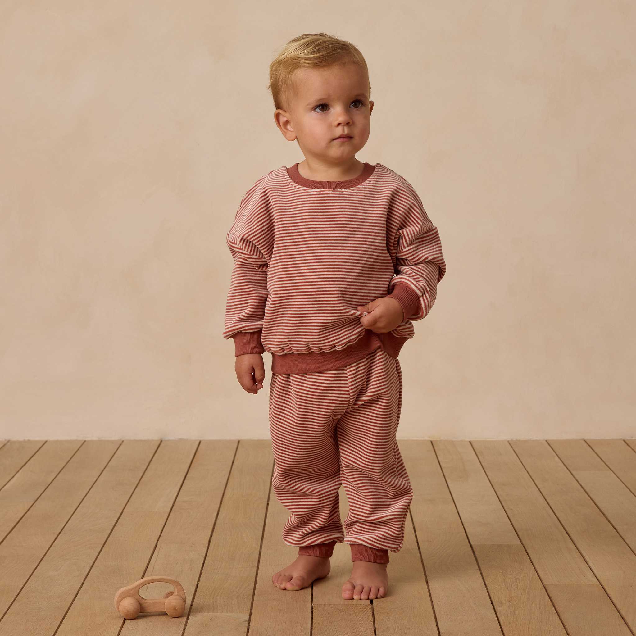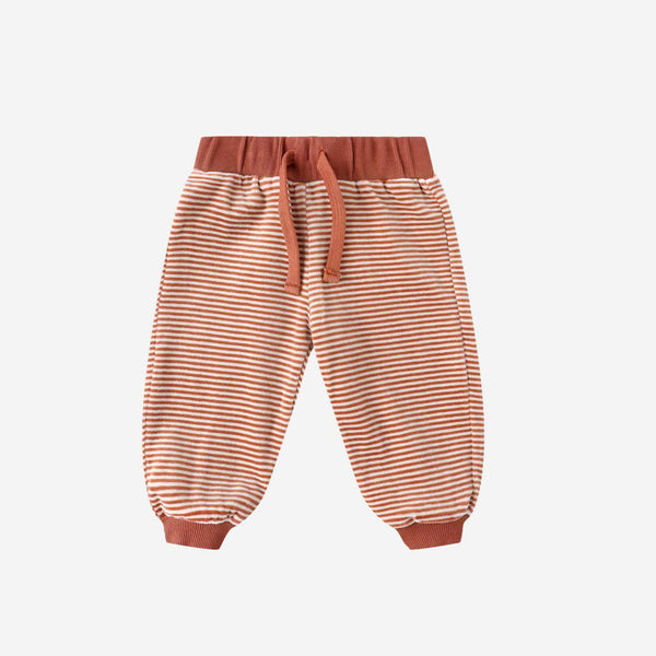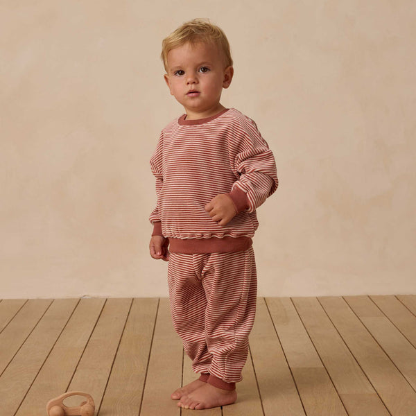 Soft, cheerful, and effortlessly cozy—the Velour Relaxed Sweatpant in Candy Stripe brings a playful holiday twist to everyday comfort. Made from plush organic cotton velour, these easy pull-on pants are perfect for lounging, play, and festive family moments.