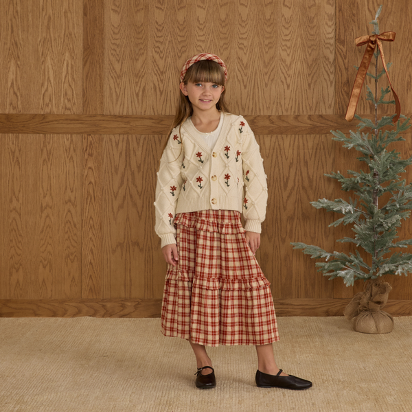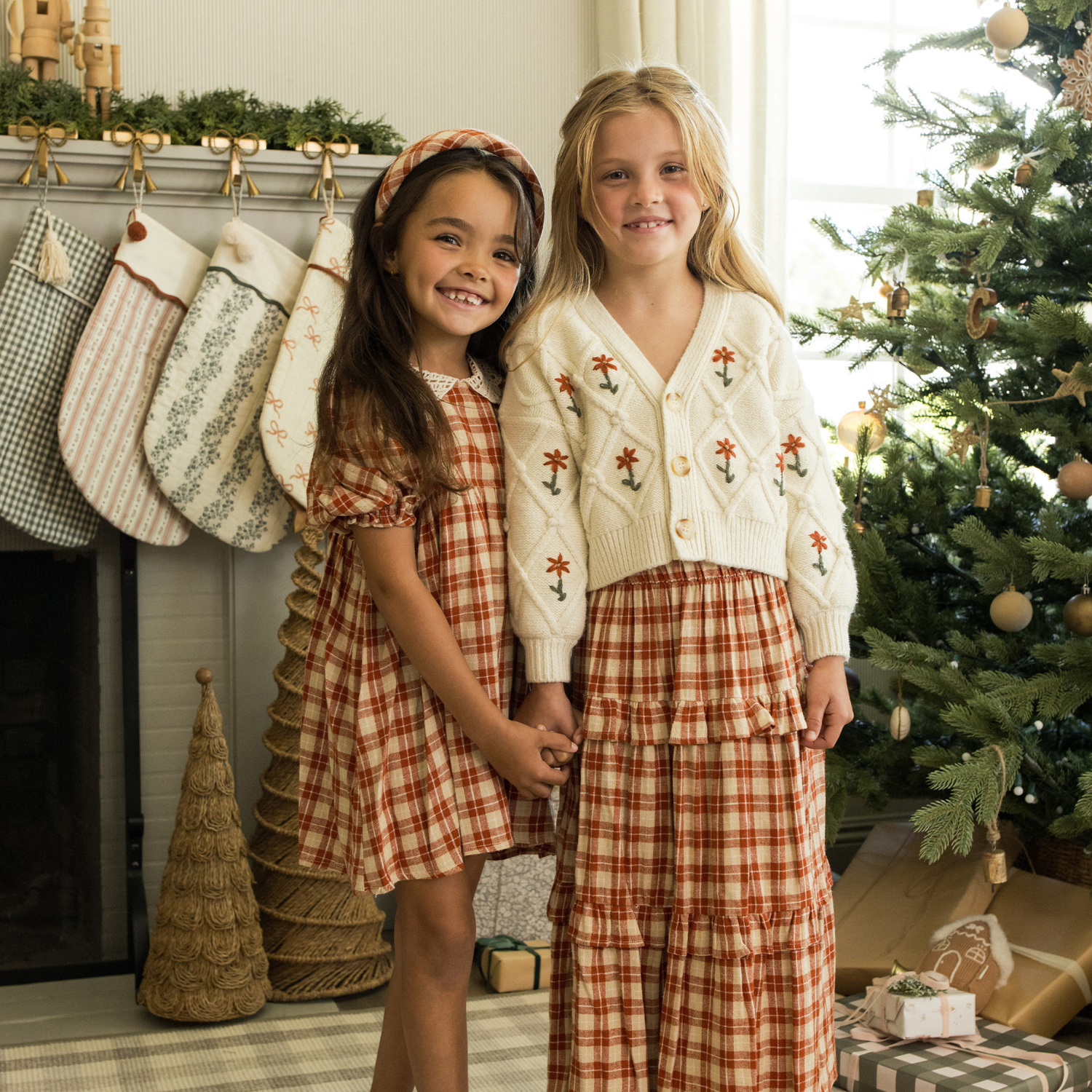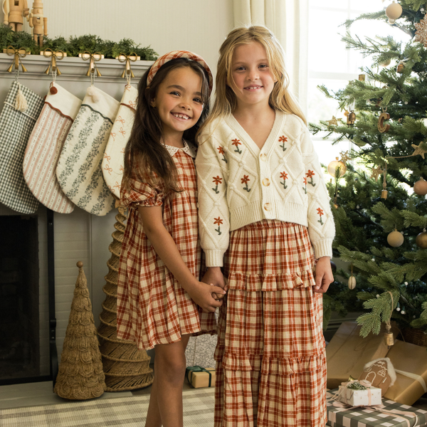 A cozy layer with heirloom charm. The Boxy Crop Cardigan features bubbled sleeves, a button-front closure, and the sweetest Winter Daisy embroidery on a soft natural base. With its cropped, boxy fit, this cardigan is perfect for layering over holiday dresses, rompers, or everyday outfits.