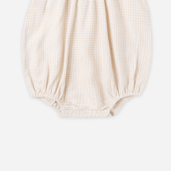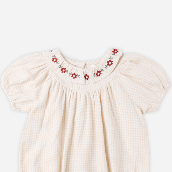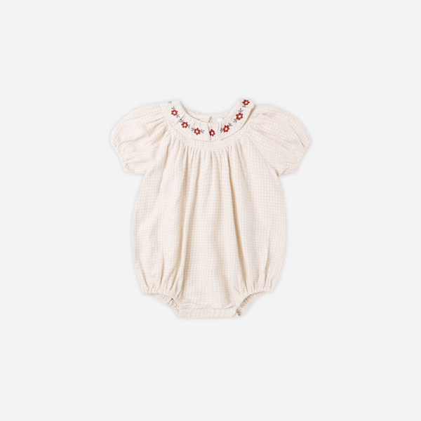 Sweet details meet timeless design. The Lula Romper is a darling holiday piece with a bubble silhouette, delicate ruffle trim, and an embroidered floral collar that makes it extra special. Elastic openings and bottom snaps keep changes quick and comfortable, while the gingham print adds a classic, festive charm.
