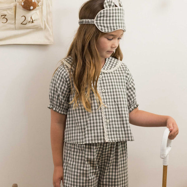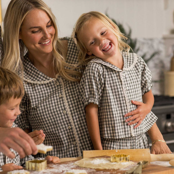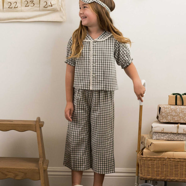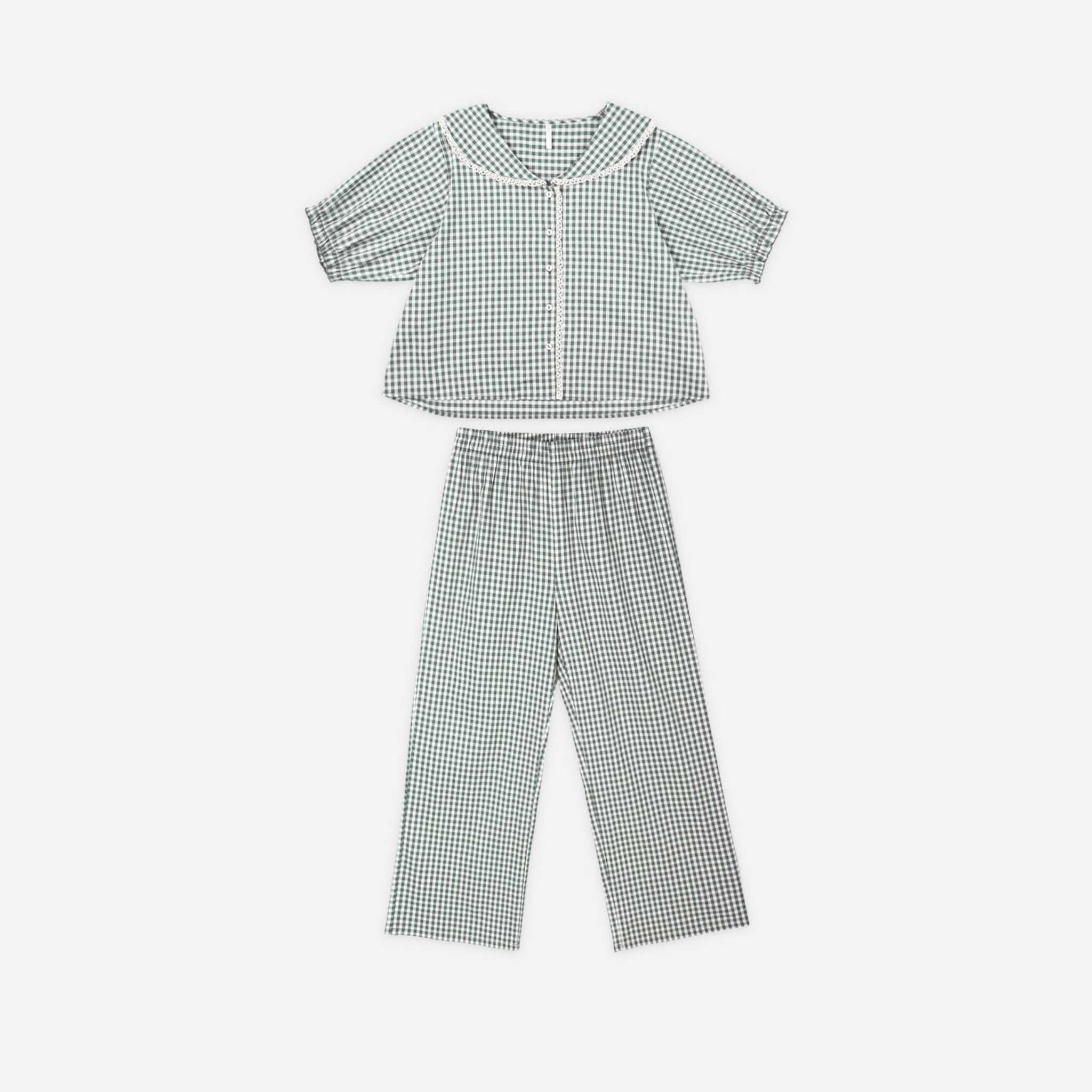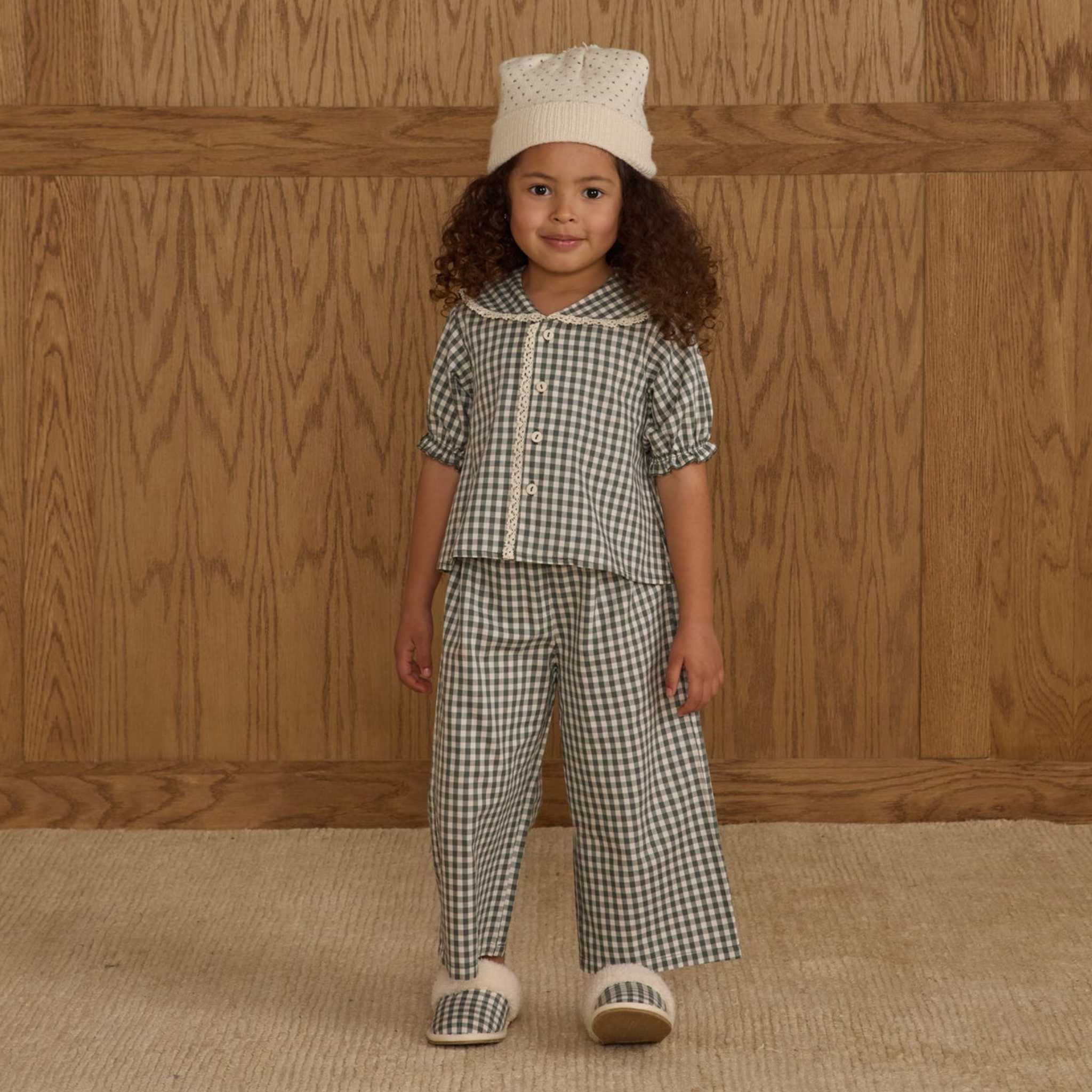 Add To BabylistCozy mornings feel even sweeter in this charming two-piece pajama set. The ruffle-collar top pairs with easy wide-leg pants for a look that feels both timeless and playful. Soft, breathable fabric brings everyday comfort, while the classic Evergreen Gingham print adds a festive touch that families love.