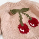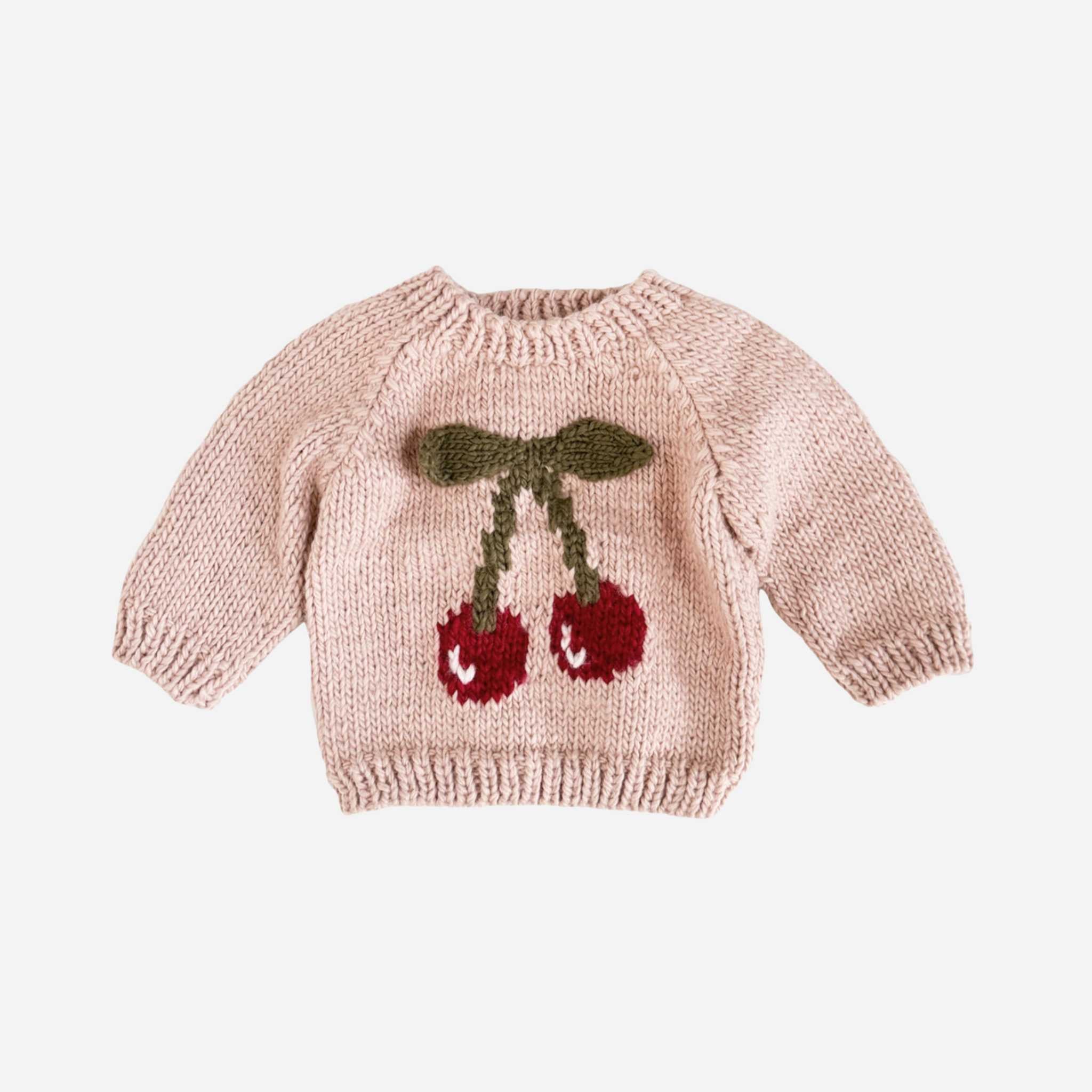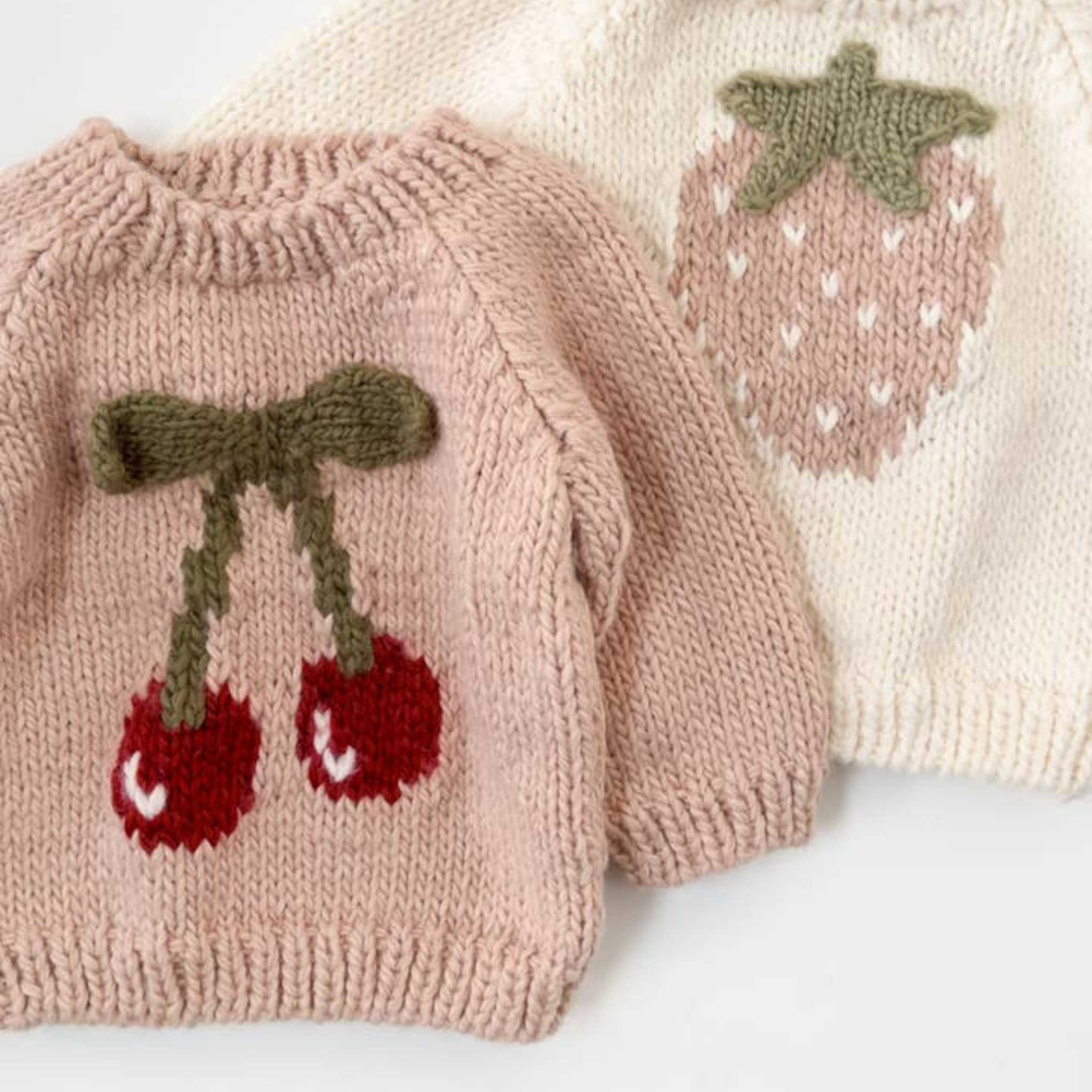 Brighten little wardrobes with the cheerful charm of the Cherry Pullover Sweater. Soft, hand-knit acrylic in a blush pink hue is adorned with a playful cherry motif and knitted moss-green leaves, adding a touch of whimsy to everyday outfits. Pair it with a matching Classic Pom Hat in Blush, Red, or Moss for an extra-cozy, coordinated look.