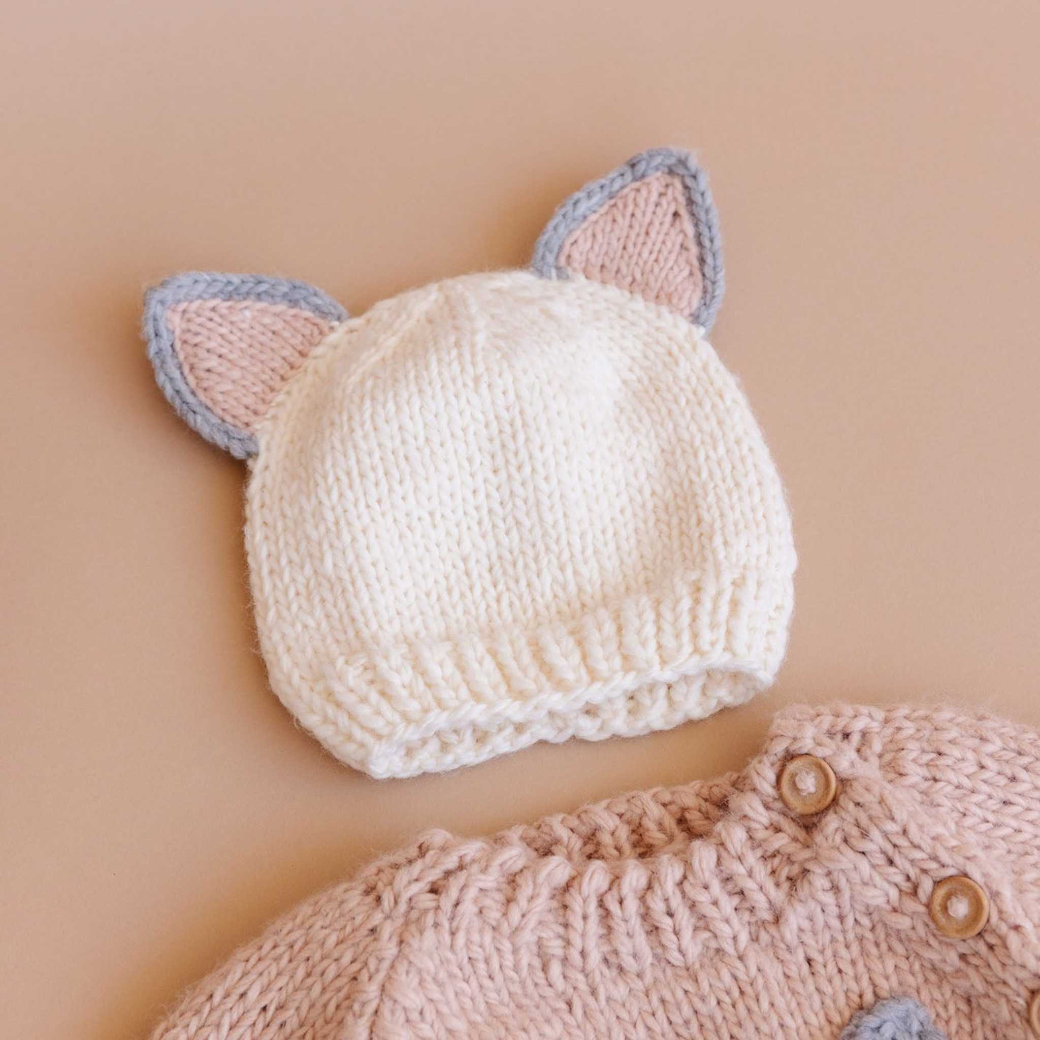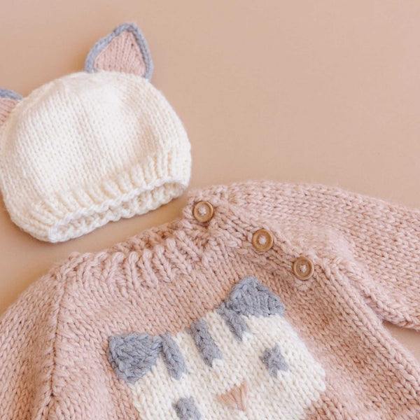 Add a playful touch to chilly days with the Knit Kitty Cat Hat. Soft, hand-knit acrylic in cream is topped with blush and grey kitty ears for an irresistibly cute look. Pair it with the matching Cat Pullover Sweater in Blush for a coordinated outfit that’s perfect for cozy days and photo-ready moments.