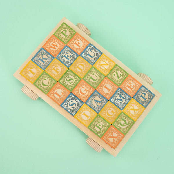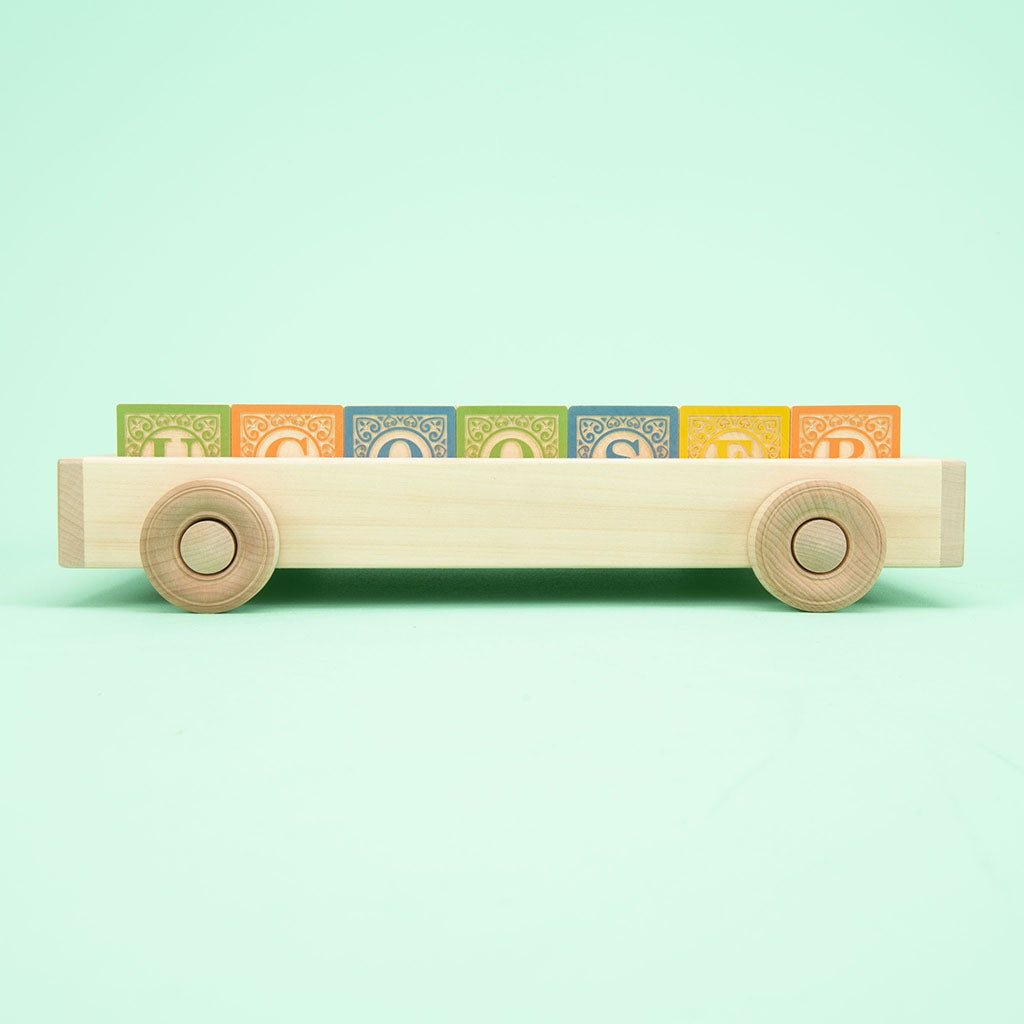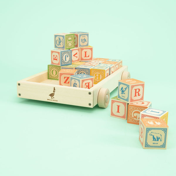 A true heirloom set, this beautiful wooden wagon and block collection brings timeless play to life. Made entirely in the USA, the sturdy Michigan basswood wagon carries 28 classic ABC blocks—ready for building, learning, sorting, and every imaginative adventure your little one dreams up. Even the wheel treads are thoughtfully lathed in Maine, and the bumper features a charming engraved Uncle Goose logo.