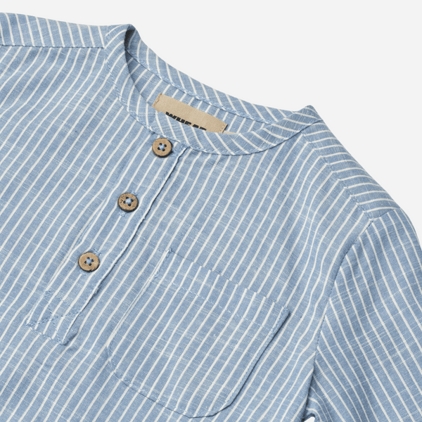 Soft, timeless, and made for memorable days. The Bjork Shirt – Blue Stripe by WHEAT brings a gentle blend of comfort and polish to your baby’s wardrobe. Woven from breathable organic cotton in soft blue stripes, this long-sleeved shirt offers a relaxed fit with thoughtful details—perfect for special moments and everyday sweetness.